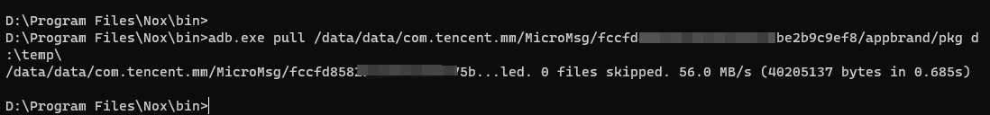 adb.exe pull /data/data/com.tencent.mm/MicroMsg/fccfdxxxxx9c9ef8/appbrand/pkg d:\temp\