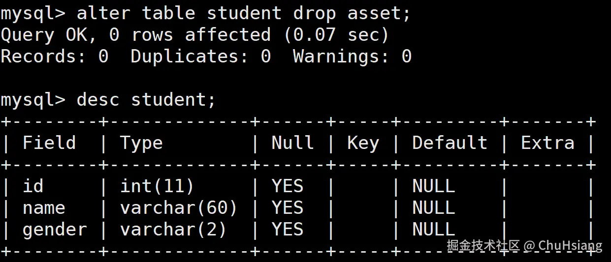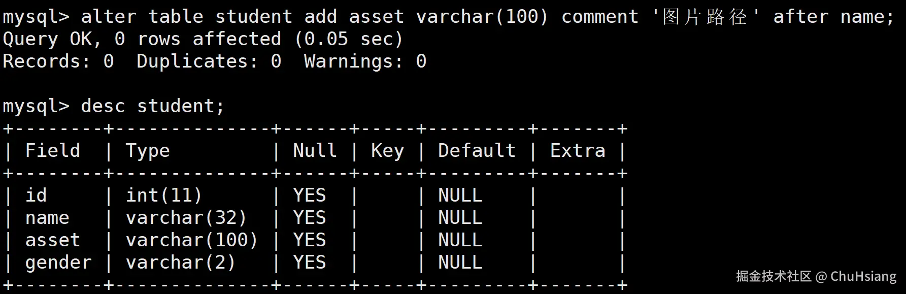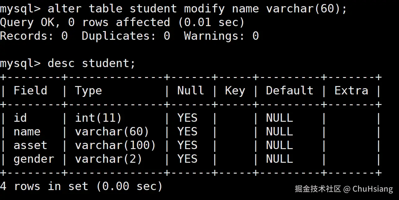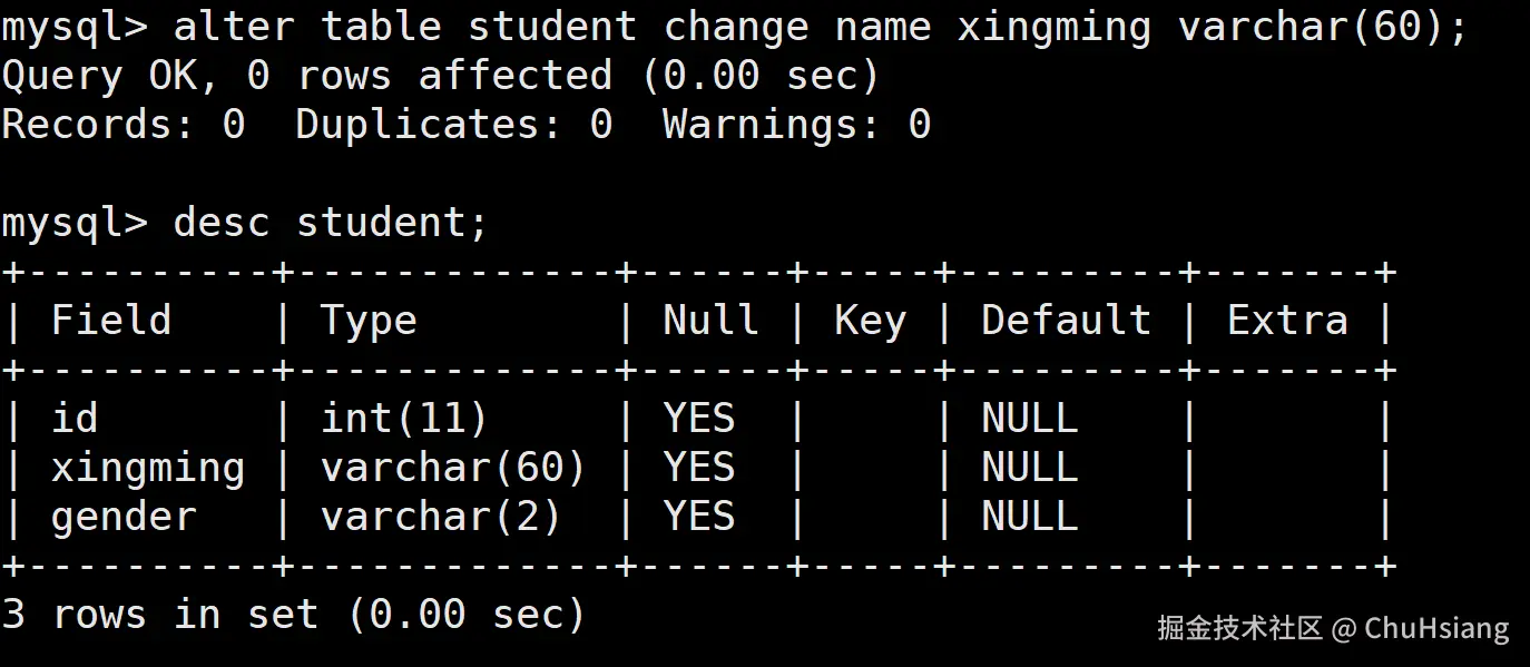 alter table student change name xingming varchar(60);--新字段选哟完整定义