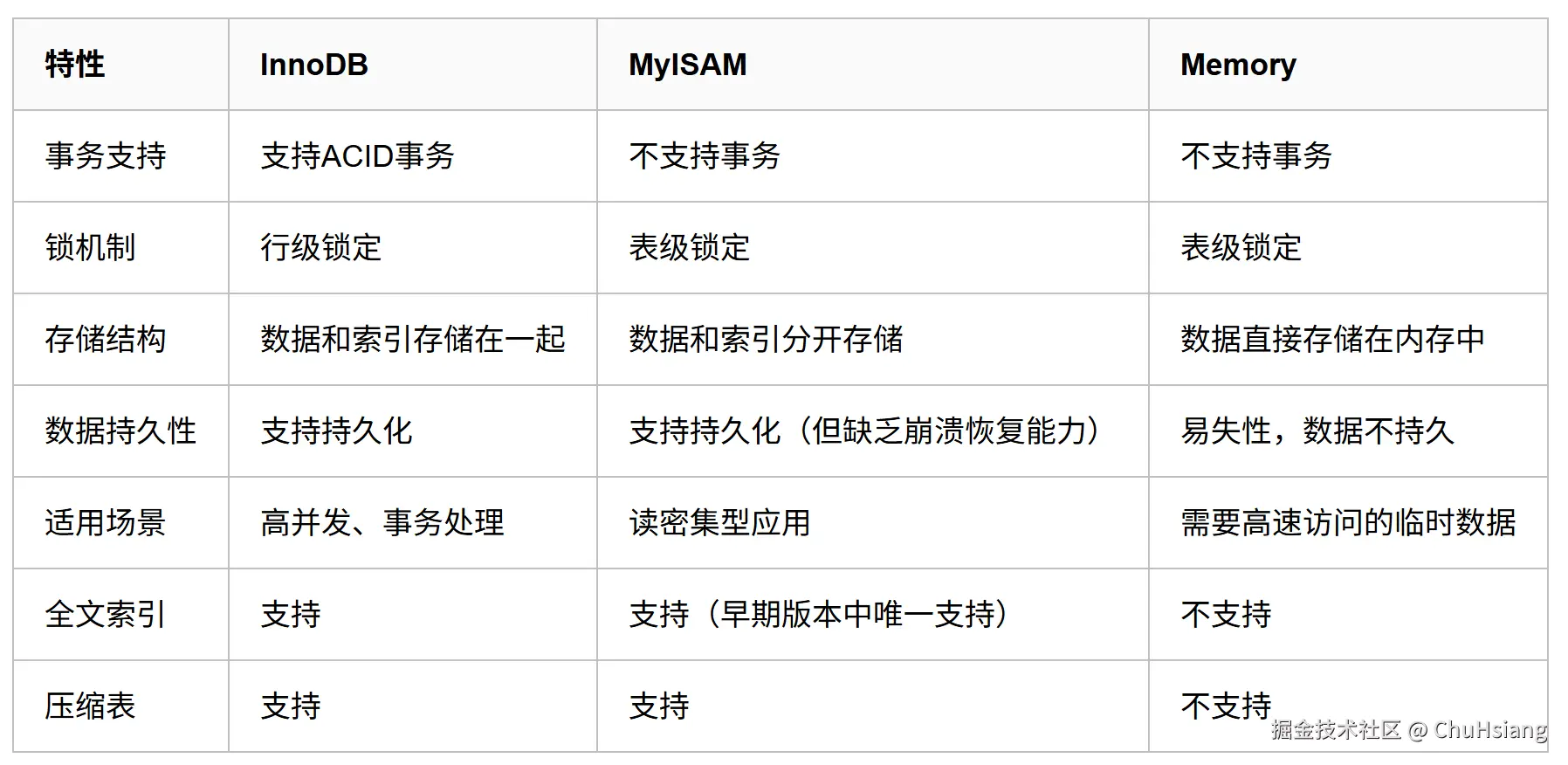以下是对InnoDB、MyISAM和Memory三种存储引擎在事务支持、存储结构、锁等方面的纤细对比: