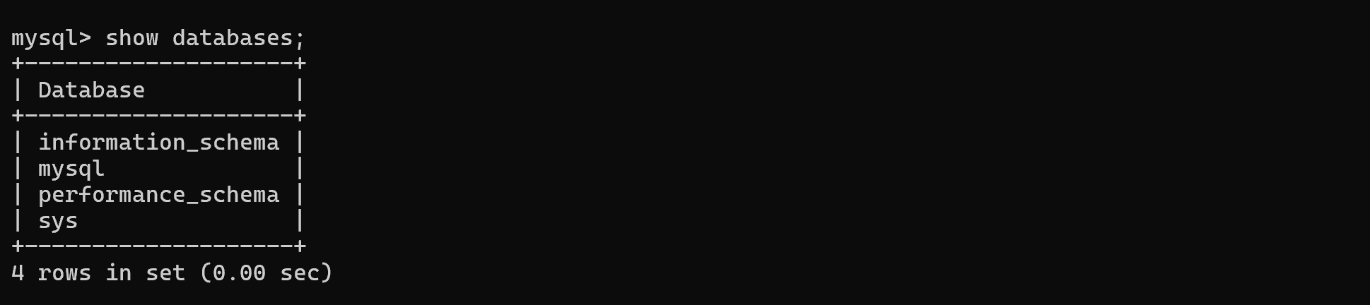 执行后会显示系统默认数据库 和自定义数据库。系统默认数据库记录关于MySQL自身的配置,性能,系统变量信息