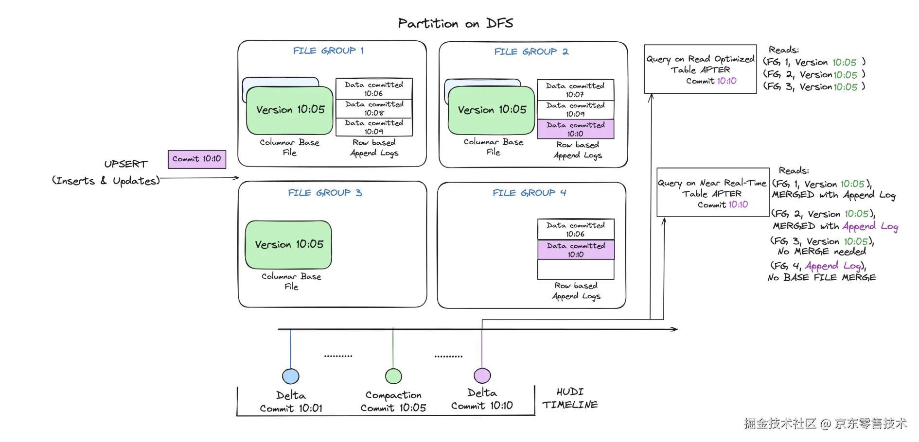 然后在查询执行期间将日志文件中的这些更改动态地与基文件合并。这种方法可以降低写入延迟并支持近乎实时的数据可用性。但是,查询性能可能会因日志文件是否被压缩而有所不同。