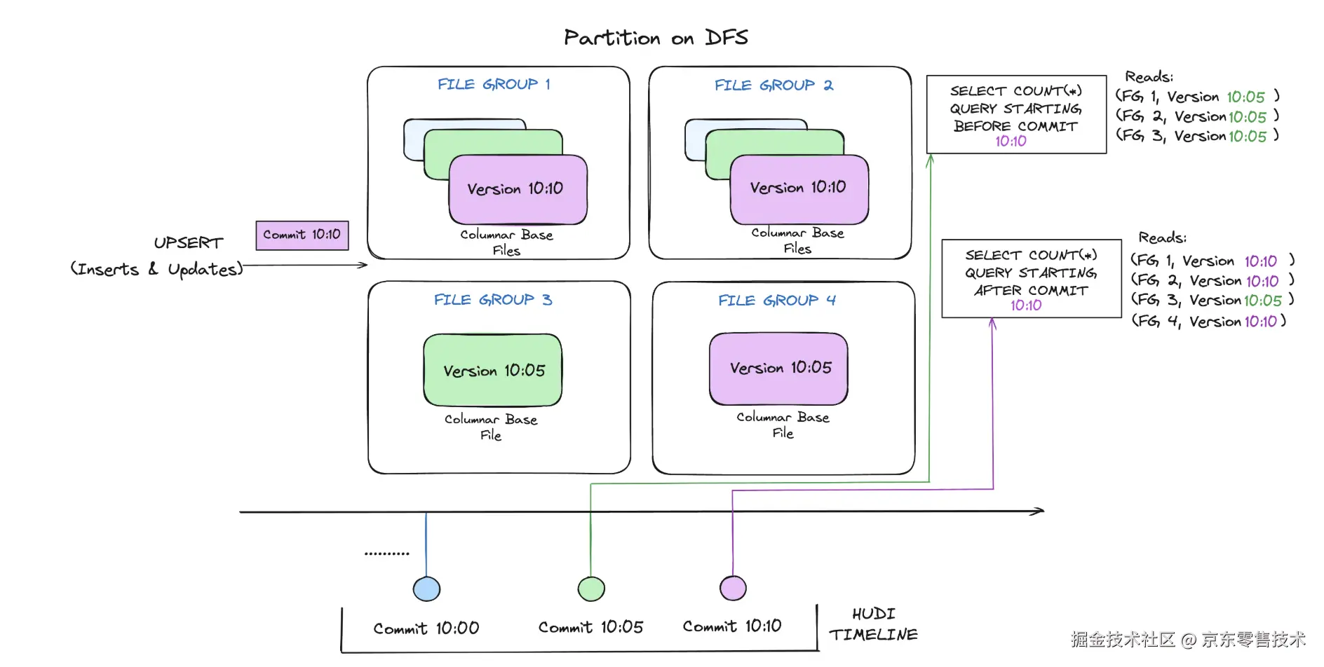 这些文件切片及其提交完成的时刻已在上方以同一颜色编码。针对上图 SQL 查询首先检查已完成写入的时间线,并过滤每个文件组除最新文件切片之外的所有文件切片。如您所见,较旧的查询不会看到