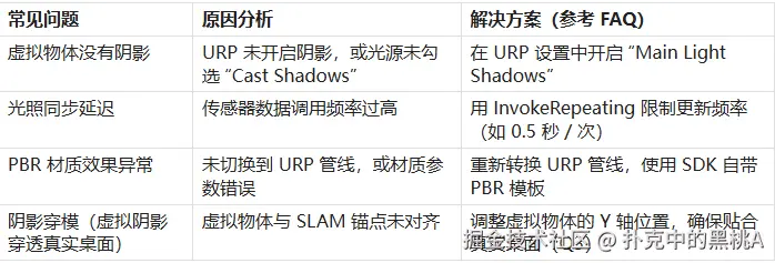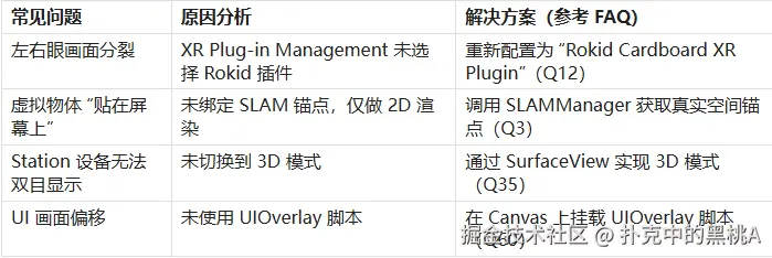 FAQ 汇总 (forum.rokid.com/post/detail...):开发中 90% 的渲染问题(比如左右眼分裂、光照延迟),这里都有人帮你踩过坑了。