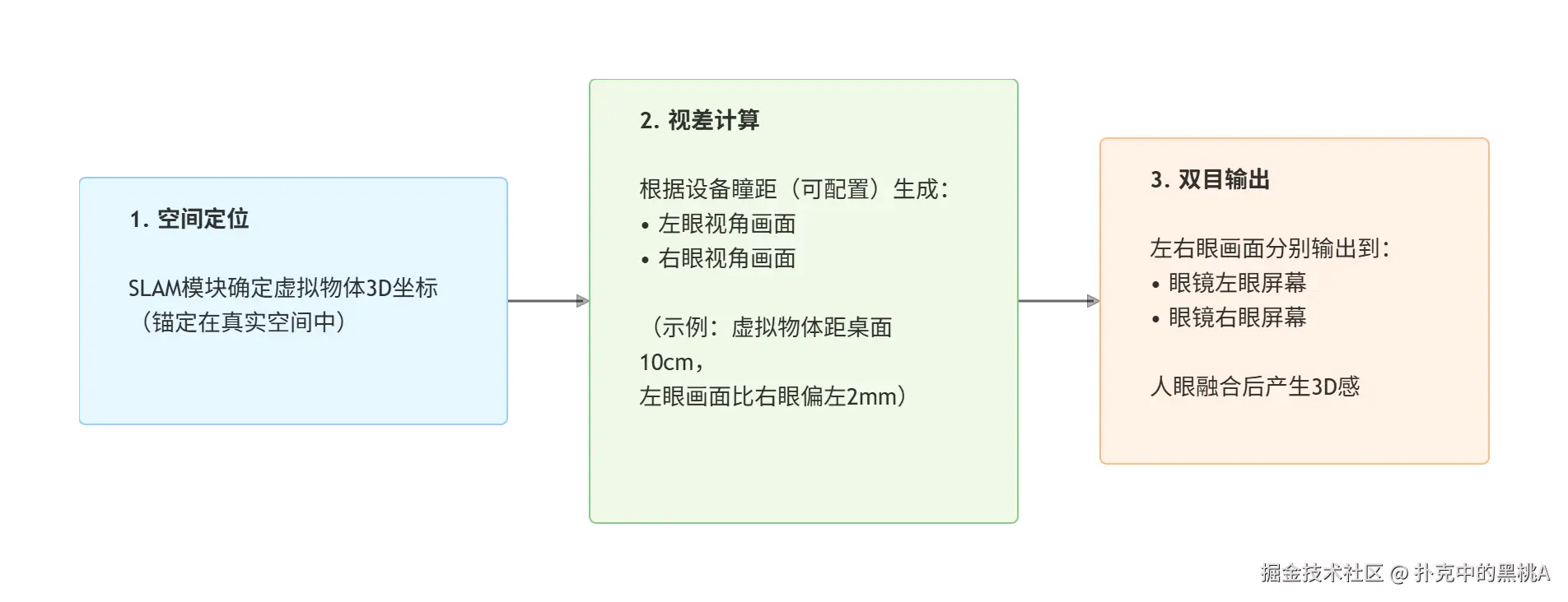 AR 的 3D 感觉,全靠双目立体显示来撑场面。这玩意儿其实就是在模仿咱们人眼的"左右眼视差"------左眼和右眼看到的画面不是一模一样的,有点小差别,大脑就把这两个画面一合成,嘿,一个有深度的 3D 图像就出来了。