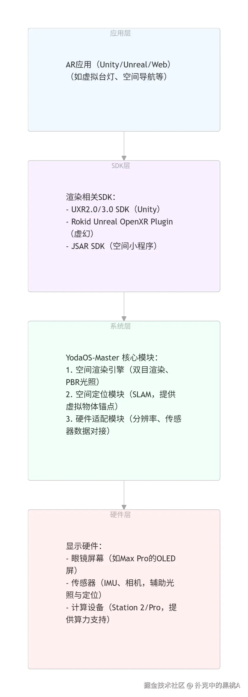 你看这张图就明白了:所有渲染效果的实现,说白了,都是"SDK 层喊话系统层,系统层调用硬件资源"这么个逻辑。举个例子,咱们想实现双目显示,就得通过 UXR SDK 去调用系统层的"双目渲染引擎",然后这个引擎再去跟 Max Pro 眼镜的屏幕"对个话",搞定分辨率适配。
