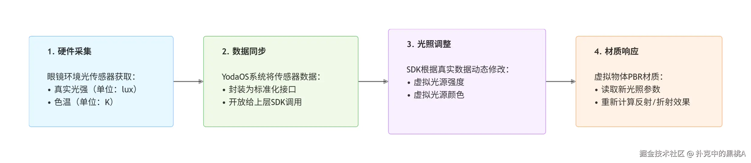 YodaOS-Master 会用眼镜上的环境光传感器(比如 Max Pro 前面的那个),去"感受"真实环境的光有多亮、色调是冷是暖,然后把这些信息"告诉"虚拟光源。它的工作流程大概是这样(看下图):
