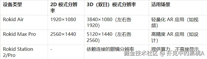 划个重点:3D 模式下的分辨率,其实是"左眼分辨率 + 右眼分辨率"。比如 Air 眼镜的 3D 模式是 3840×1080,意思就是给左眼和右眼各一个 1920×1080 的画面。所以开发的时候,UI 适配一定要注意,不然画面可能就被切掉一块。