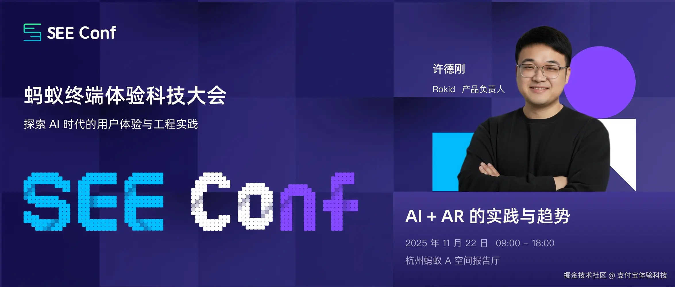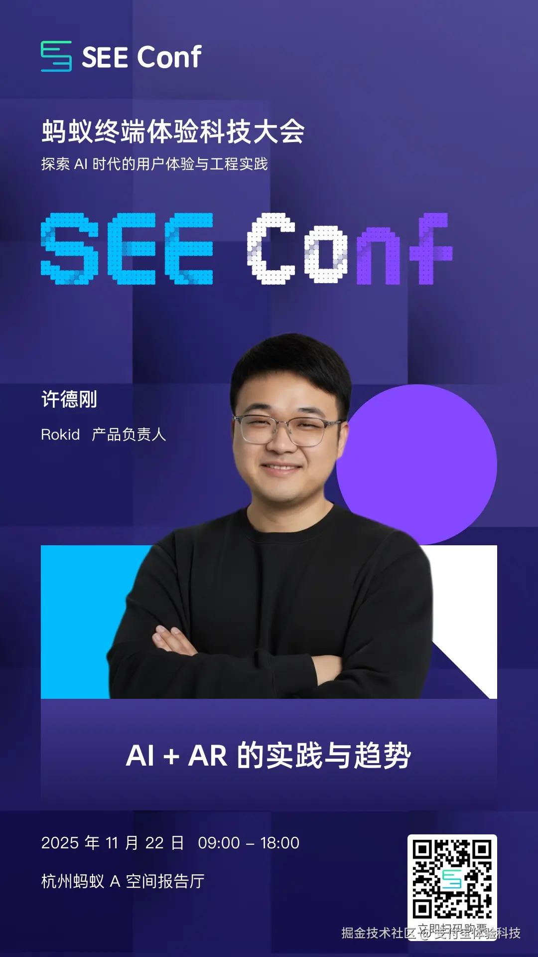 在 Rokid 的理念中,真正的智能设备应让技术主动融入生活,而非让用户去适应技术。在 SEE Conf 2025 蚂蚁终端体验科技大会上,许德刚将带来关于 《AI + AR 的实践与趋势》 的深度分享,解析 Rokid 如何以 AI 赋能 AR,从交互、感知到体验,推动下一代智能终端的可能性边界。