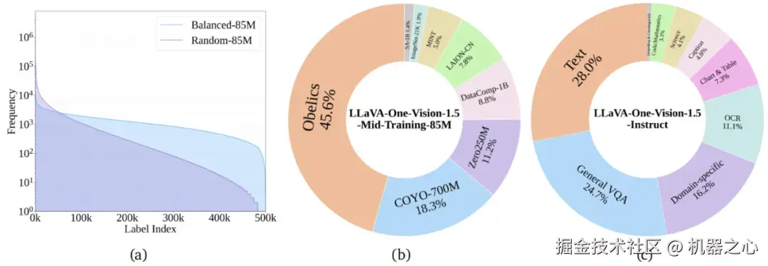 为破解长尾概念稀疏与原始 caption 噪声 / 缺失问题,我们不再依赖原始文本词频,而是采用特征驱动的「概念均衡」策略:利用 MetaCLIP 编码器将全部图像与 50 万规模概念词嵌入共享向量空间,对每张图像检索 Top-K 最相似概念,统计概念频次后按逆频加权重采样,抑制高频背景类并提升罕见细粒度实体、属性与场景占比,显著平坦化长尾分布;随后使用高质量 Captioner 生成对齐的中英文增强描述。系统实验表明,在相同或更低 token 预算下,扩大高质量数据规模并结合概念均衡采样,可在多模态理解、长尾识别与指令泛化等核心指标上获得显著且可复现的性能提升。