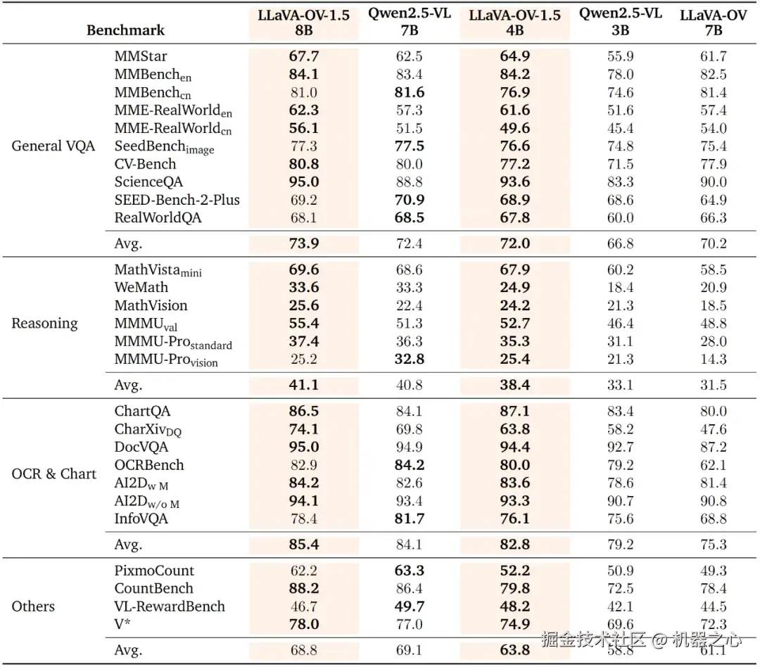 实验结果显示,LLaVA‑OneVision 在多项公开多模态基准上较 Qwen2.5‑VL 展现出竞争性乃至更优性能(详见技术报告)。