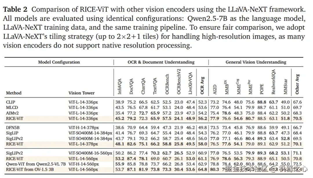 为了让模型在 OCR、表格 / 文档、区域理解与后续指令推理上具有更高的下限,我们在 LLaVA-OneVision-1.5 中采用自研的 MVT v1.5(RICE-ViT) 作为视觉主干。