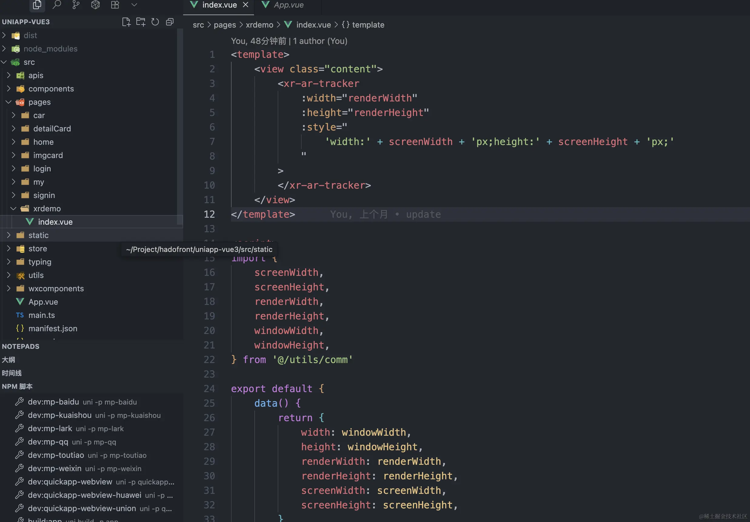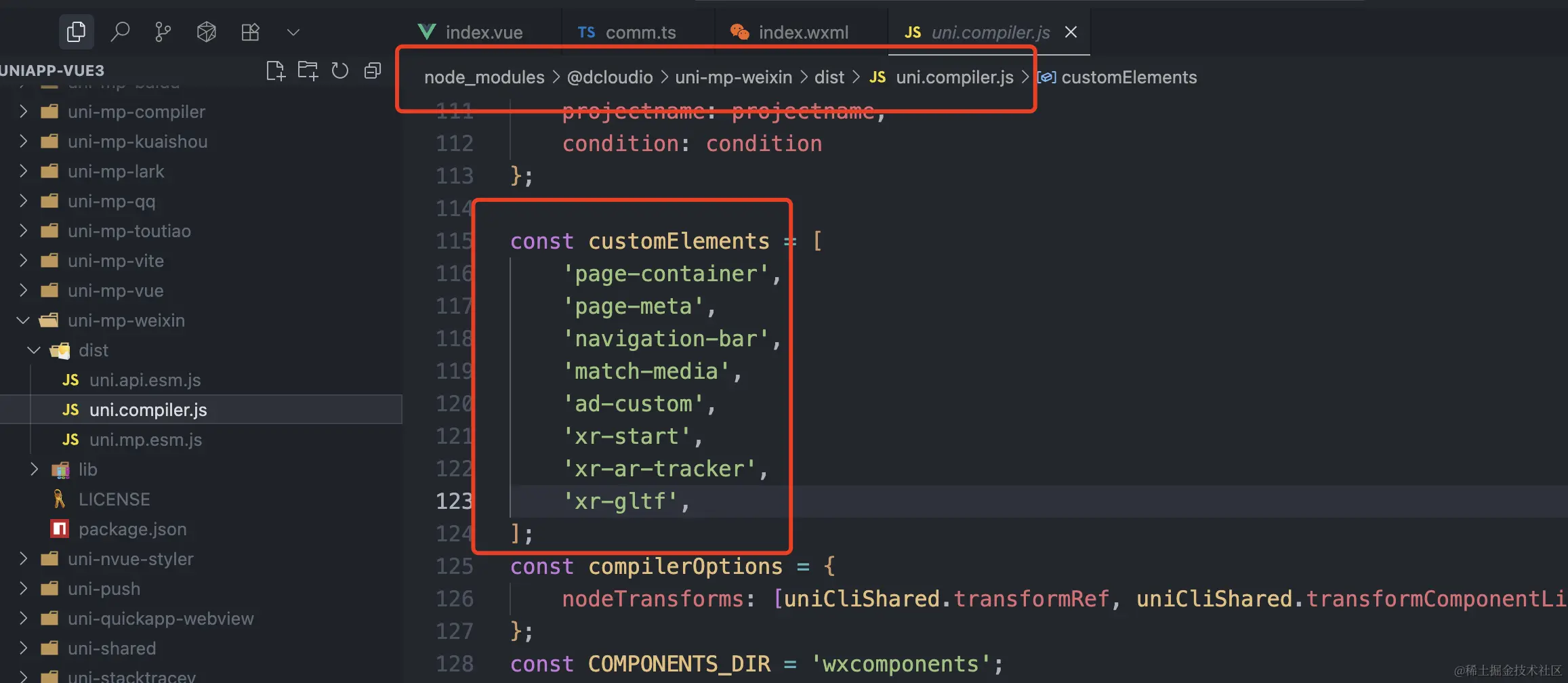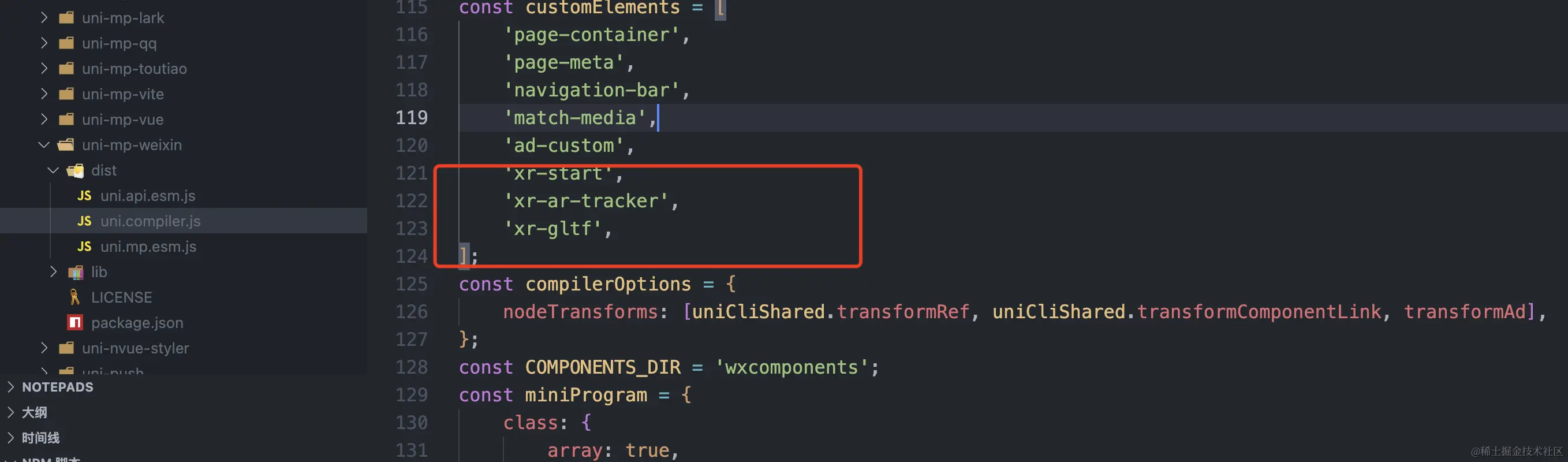 这里拿到宽高之后,要给到xr-ar-tracker这个组件,但是需要注意:一定要先修改uniapp底层的编译代码,修改的文件/node_modules/@dcloudio/uni-mp-weixin/dist/uni.compiler.js里面的customElements变量:
