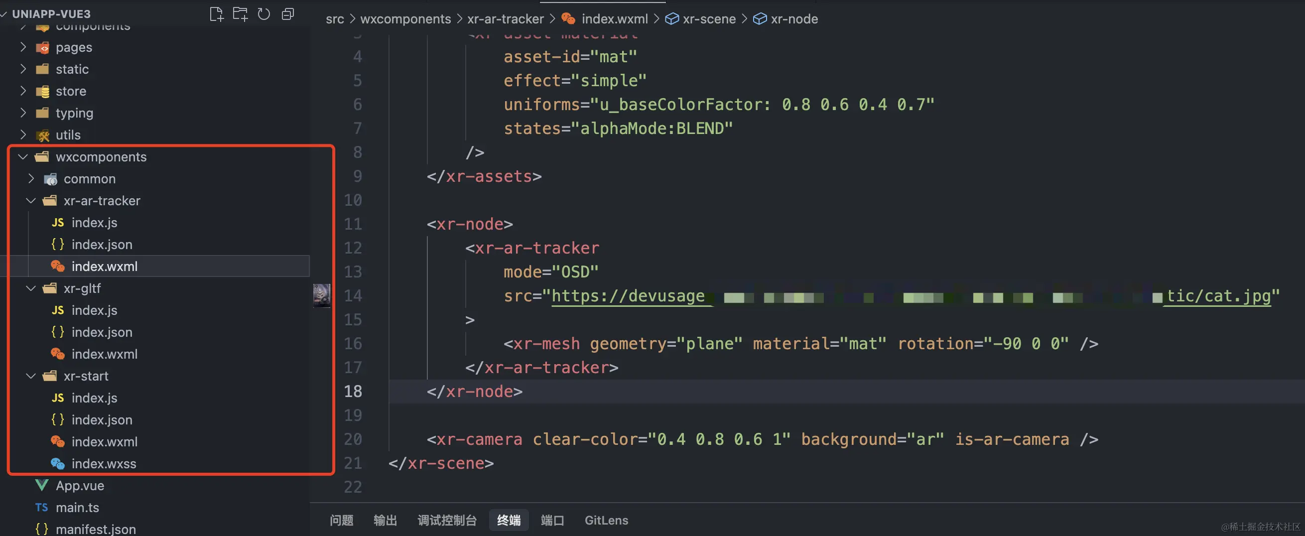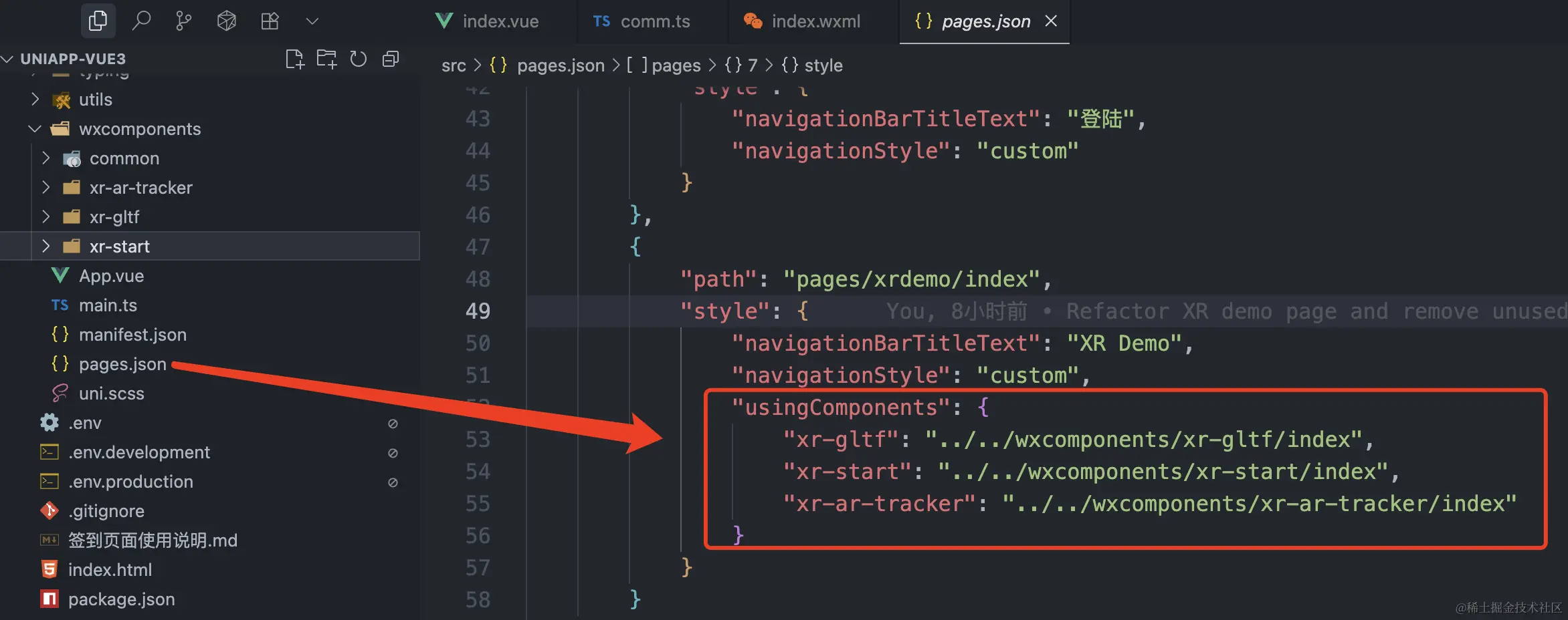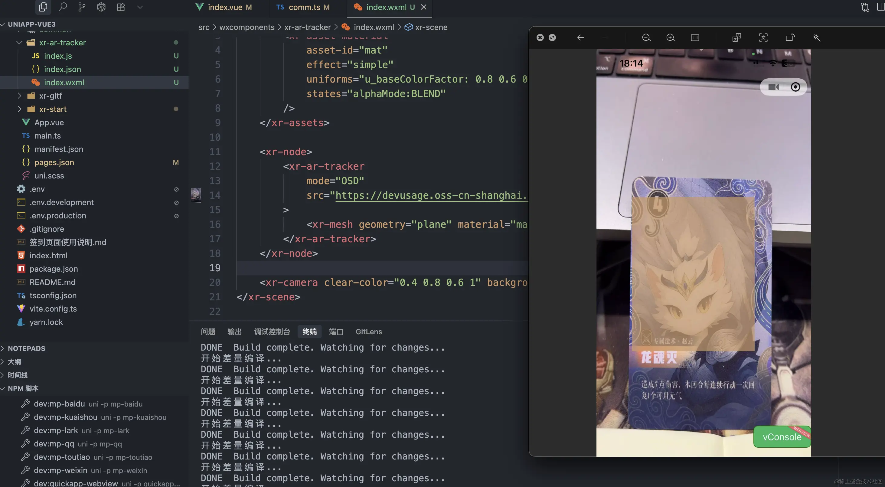这里拿到宽高之后,要给到xr-ar-tracker这个组件,但是需要注意:一定要先修改uniapp底层的编译代码,修改的文件/node_modules/@dcloudio/uni-mp-weixin/dist/uni.compiler.js里面的customElements变量: