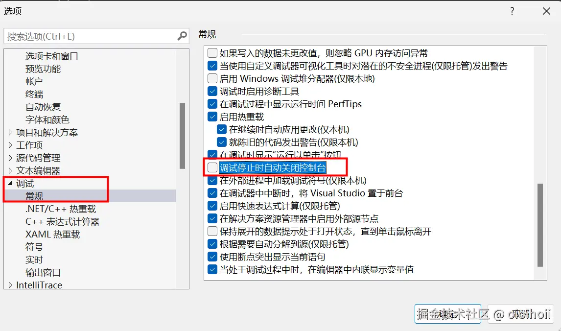 - 在常规设置列表中,滚动查找"调试停止时自动关闭控制台"(Automatically close the console when debugging stops)选项