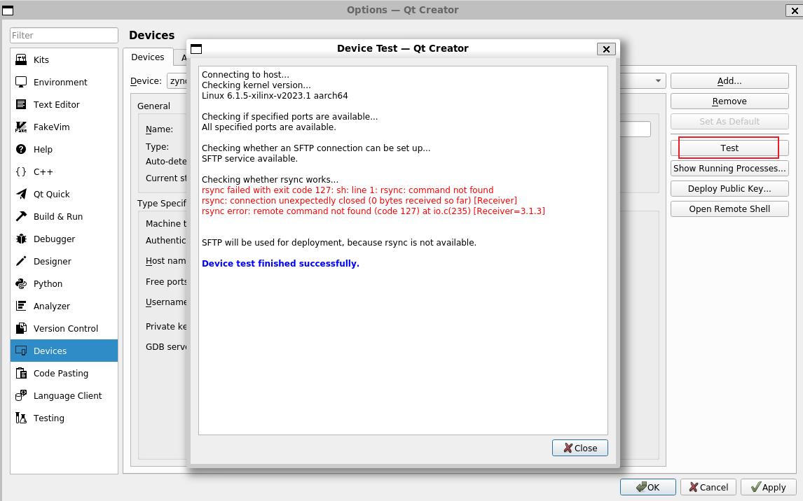 测试设备,测试设备也是成功连接的。这里有个报错信息,提示没找到rsync命令,会使用sftp。