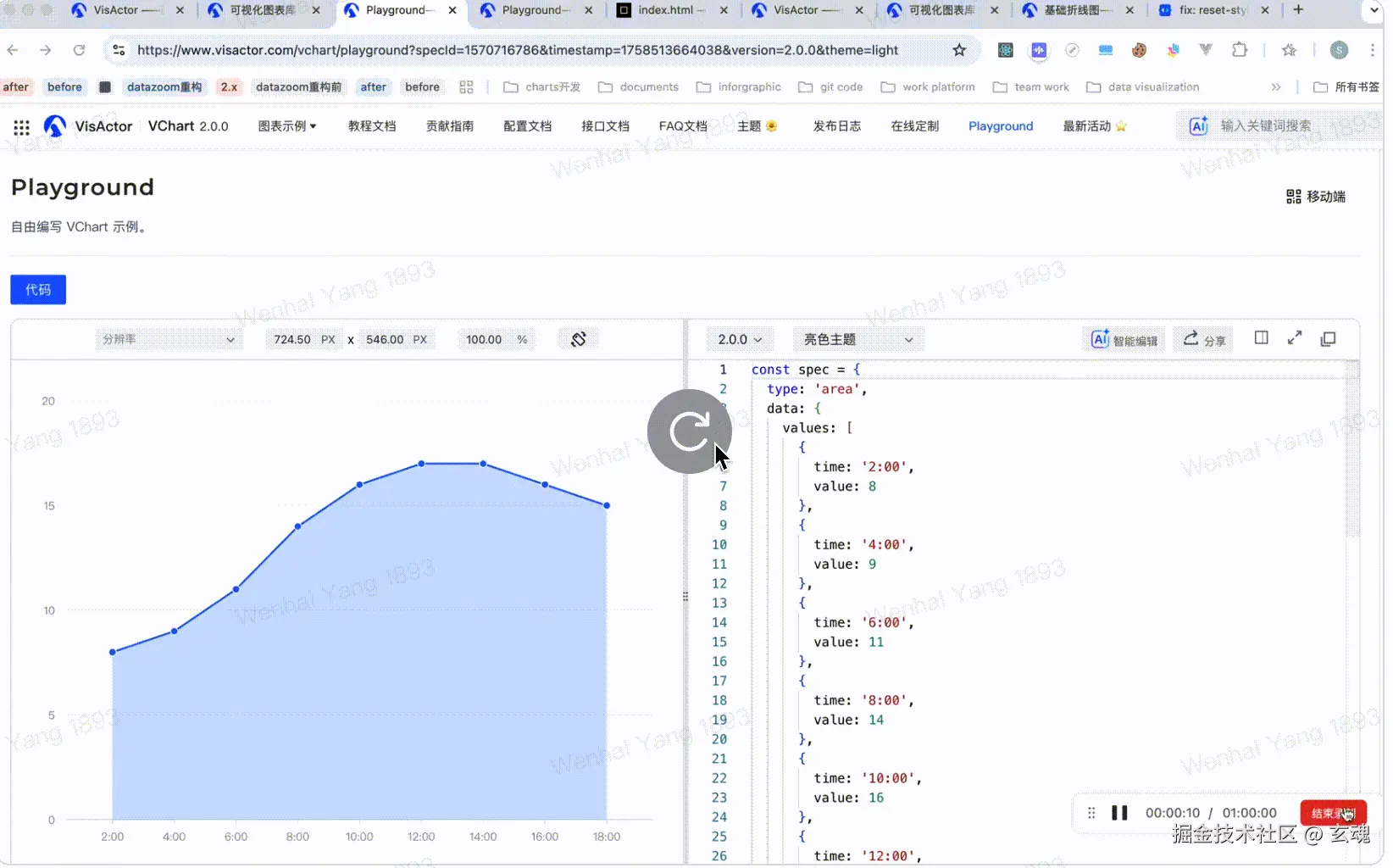 一键将您的图表配置分享为一个独立的 Playground 链接。您的同事或合作伙伴无需任何本地配置,即可在浏览器中直接查看、修改和调试图表,更可以用来和官方反馈问题,github 提issue时使用。