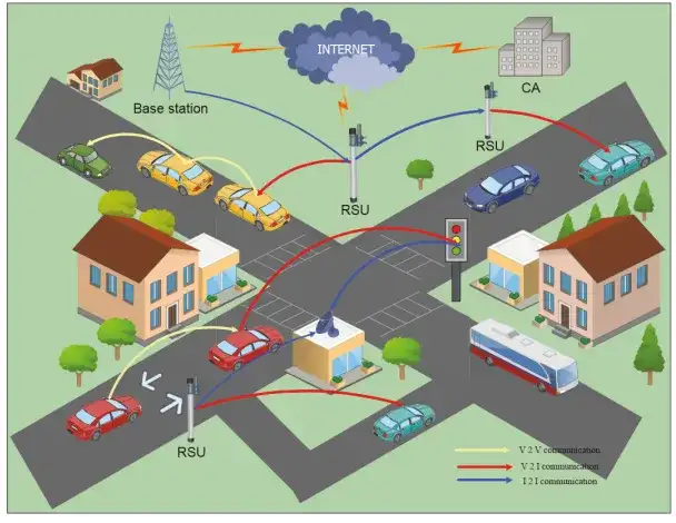 车载自组织网络(VANETs)由两种基本无线终端构成,即车载单元(OBU)和路侧单元(RSU)。车载单元是安装在车辆内部的嵌入式无线设备,用于与路侧单元以及其他车辆的车载单元进行通信。路侧单元则部署在道路或基础设施的关键位置,是通信的无线接入点。每个终端都相当于一个节点,能够在无线网络中接收和转发消息。如图 1 所示,这些节点可作为网络中其他节点的路由器。此外,这些接入点之间或接入点与其他设备之间还可实现路侧间通信。例如,交通信号灯之间可相互通信,路侧单元也可与蜂窝基站等进行通信。为实现高数据传输速率和低延迟,IEEE 802.11p 专用短程通信(DSRC)已被选定为车对车(V2V)和车对基础设施(V2I)通信的标准。该标准工作在 5.9 吉赫兹频段,带宽为 75 兆赫兹,在不同环境下,车辆以不同速度行驶时,其通信范围可达 300-1000 米。