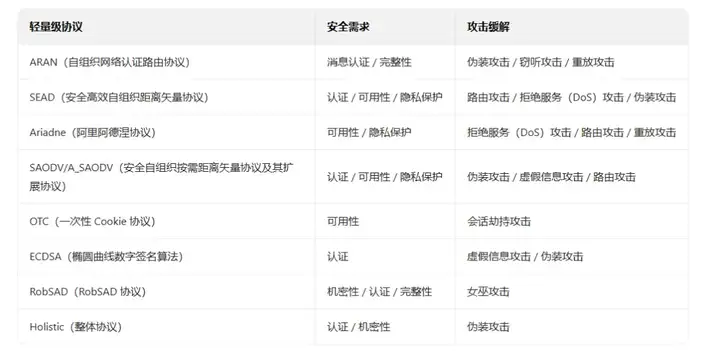 在非对称加密和对称加密的基础上,设计了以下轻量级协议,以增强未来汽车的安全性,并满足车载自组织网络(VANET)的安全需求,具体内容如表 4 所示:(1)ARAN 协议:自组织网络认证路由(ARAN)基于自组织按需距离矢量(AODV)路由协议,在该协议中,第三方证书机构(CA)向车载节点颁发已签名的证书。每个新加入网络的节点都必须向证书机构(CA)发送证书请求。所有合法节点都会获得证书机构(CA)的公钥。ARAN 协议使用时间戳确保路由的新鲜性,并采用非对称加密技术对路由发现过程进行安全认证。(2)SEAD 协议:安全高效自组织距离矢量(SEAD)协议基于动态目标序列距离矢量路由(DSDV)。该协议采用单向哈希函数进行认证。它能够防范错误的路由信息。通过使用目标序列编号,避免出现长期有效的路由,并确保路由的新鲜性。该协议通过中间节点哈希运算,确保每条路由的真实性。(3)ARIADNE 协议:该协议基于动态源路由(DSR)按需路由协议。ARIADNE 协议在对称加密操作方面表现高效。它采用单向哈希函数和消息认证码(MAC)认证,实现节点间的安全通信。通过使用共享密钥进行授权。ARIADNE 协议源于 TESLA 广播认证技术,该技术利用 TESLA 时间间隔进行认证和路由发现过程。(4)SAODV 协议:该协议旨在为自组织按需距离矢量(AODV)协议增加安全功能。采用哈希函数保护跳数,并对所有消息进行数字签名,以确保路由的真实性。然而,这种方法会导致中间节点即使知道最新的路由,也无法发送任何路由回复。通过使用双重签名可以解决这一问题,但会增加系统的复杂度。(5)A-SAODV 协议:研究人员提出了安全自组织按需距离矢量(SAODV)协议的扩展版本,即 A-SAODV 协议,该协议具备自适应回复决策功能。根据阈值条件和队列长度,每个中间节点都可以决定是否向源节点发送回复。(6)OTC 协议:通常,为进行会话管理,会为每个会话分配一个 Cookie。一次性 Cookie(OTC)协议旨在保护系统免受会话标识(SID)窃取和会话劫持攻击。该协议为每个请求生成令牌,并通过哈希消息认证码(HMAC)将令牌附加到请求中,以防止令牌被重复使用。(7)ECDSA 算法:椭圆曲线数字签名算法(ECDSA),顾名思义,采用数字签名技术。结合非对称加密操作和哈希函数,为系统提供安全性和真实性保障。发送方和接收方都需要就椭圆曲线参数达成一致。(8)RobSAD 协议:该协议提供了一种高效的女巫攻击检测方法。如果两个或多个节点具有相似的运动轨迹,那么这些节点将被识别为女巫节点。由不同驾驶员驾驶的两辆不同车辆不可能具有相同的运动模式,因为每个人都会根据自己的需求和舒适度驾驶车辆。(9)Holistic 协议:在该协议中,路侧单元(RSU)负责对每辆车进行认证 [86]。车辆通过发送 "Hello" 消息向路侧单元(RSU)注册。作为响应,路侧单元(RSU)会生成一个注册标识(包含车辆注册号和牌照号),并发送给该车辆。后续的认证通过路侧单元(RSU)提供的证书完成。只有经过路侧单元(RSU)认证的节点才能共享数据,否则该节点将被屏蔽。