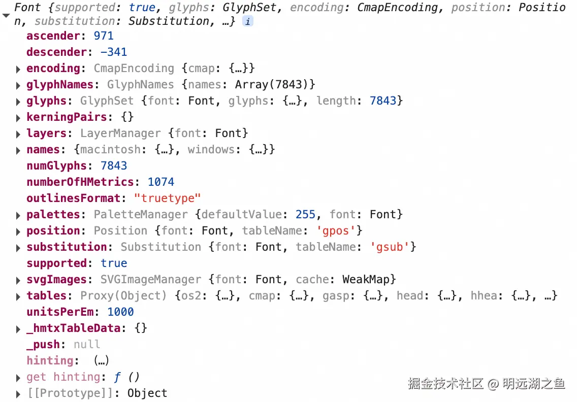 这个 font 这个对象保存了很多属性,比如所有的 glyph(字形)、一些 table(表)、字体的信息(字体名、设计师等)等等。