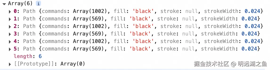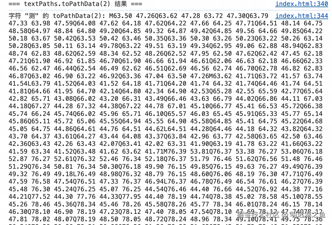 textPaths 是一个 path 数组。 字符串长度为 6,产生了 6 个 glyph(字形),所以一共有 6 个 path 对象。 形状的表达使用了经典的 SVG 的 Path 命令,对应着 command 属性。 TrueType 字体的曲线使用二阶贝塞尔曲线(对应 Q 命令);而 OpenType 支持三阶贝塞尔曲线(对应 C 命令)。