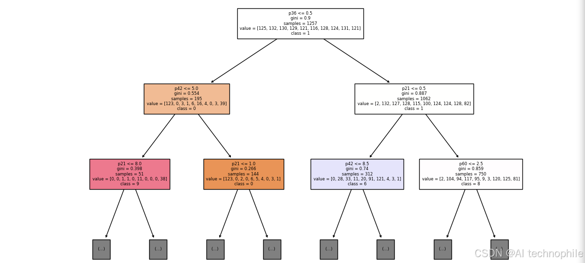 tree.plot_tree(clf, max_depth=2, feature_names=[f'p{i}' for i in range(64)],