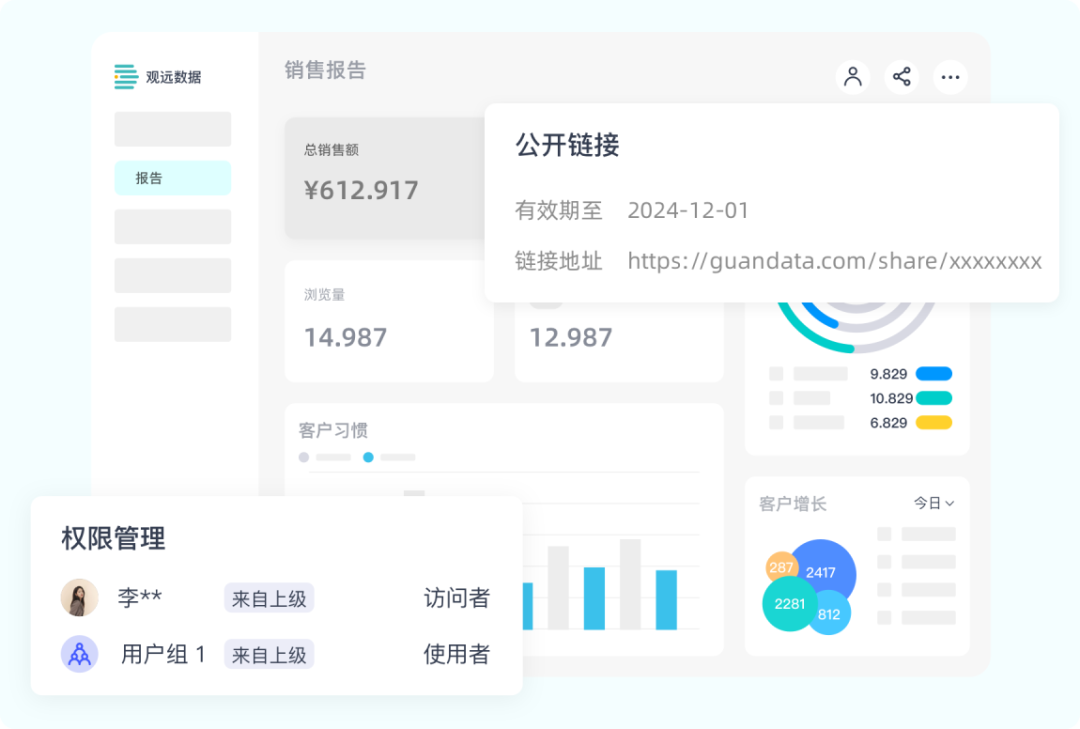 观远BI采用云原生大数据架构,稳定支撑数十亿数据量,可支持 A Blueberry 在业务拓展过程中产生的海量数据处理需求。为保障平台的稳定运行与数据安全,观远BI打造了高管控的运维平台,企业可根据不同部门、不同岗位的业务需求,灵活设置精细化的数据访问权限。此外,观远BI通过JDBC、API对接等多种方式,可高效接入文件、数据库等各类形态的数据,并通过开放 API 接口、插件产品化等方式,助力 A Blueberry 在未来的业务拓展和多元化发展中,始终拥有坚实的数据智能后盾。