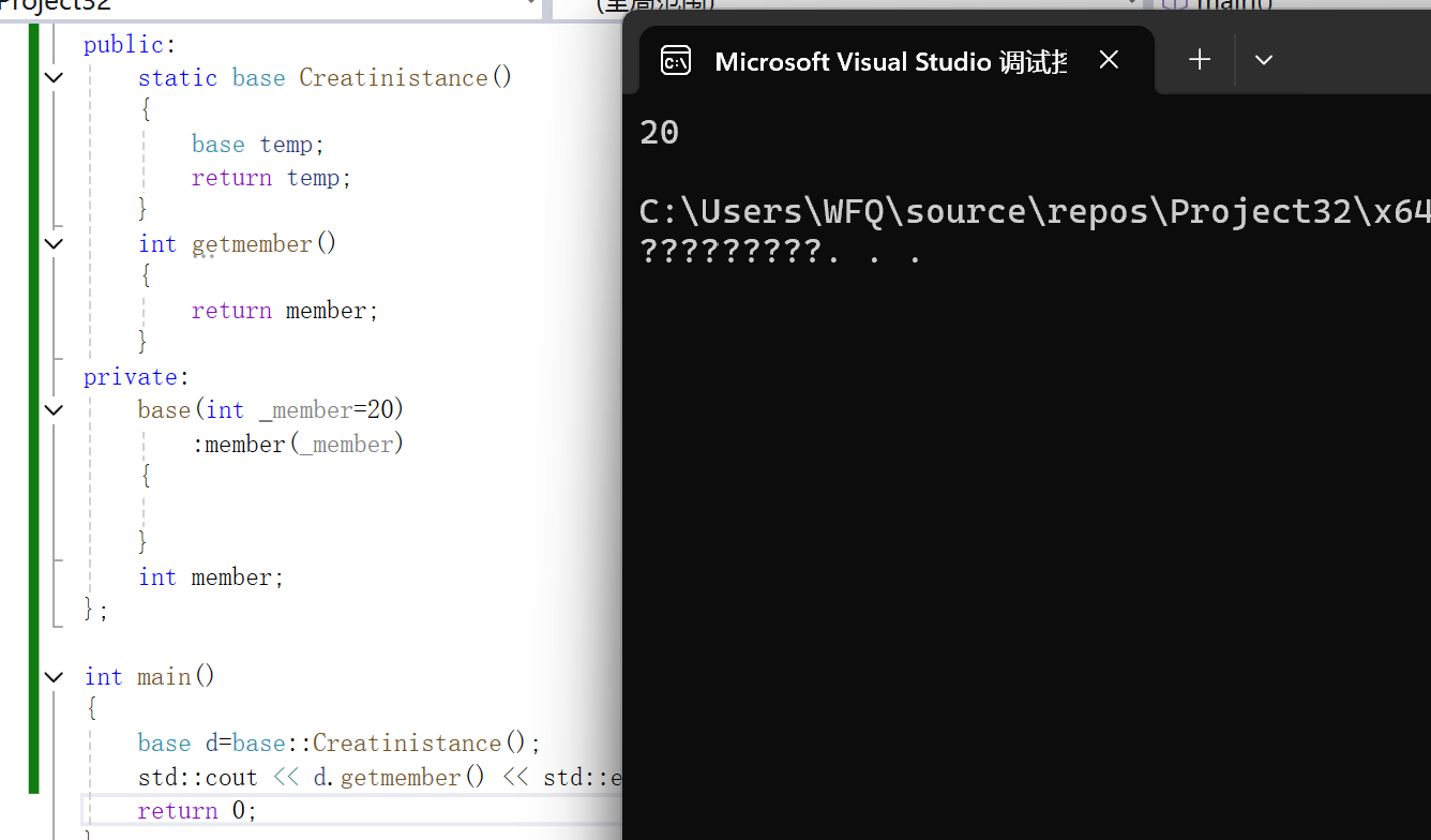 解决方式与上文所述如出一辙。既然无法在类外部访问构造函数,但可以在类内部访问,因此需要在类中定义一个公有的静态成员函数。静态成员函数不依赖于对象实例,其声明和定义位于类作用域内,故可在类外部直接调用,无需创建对象。同时,由于静态成员函数在类内部,它有权访问并调用类中的私有成员函数(包括构造函数)。