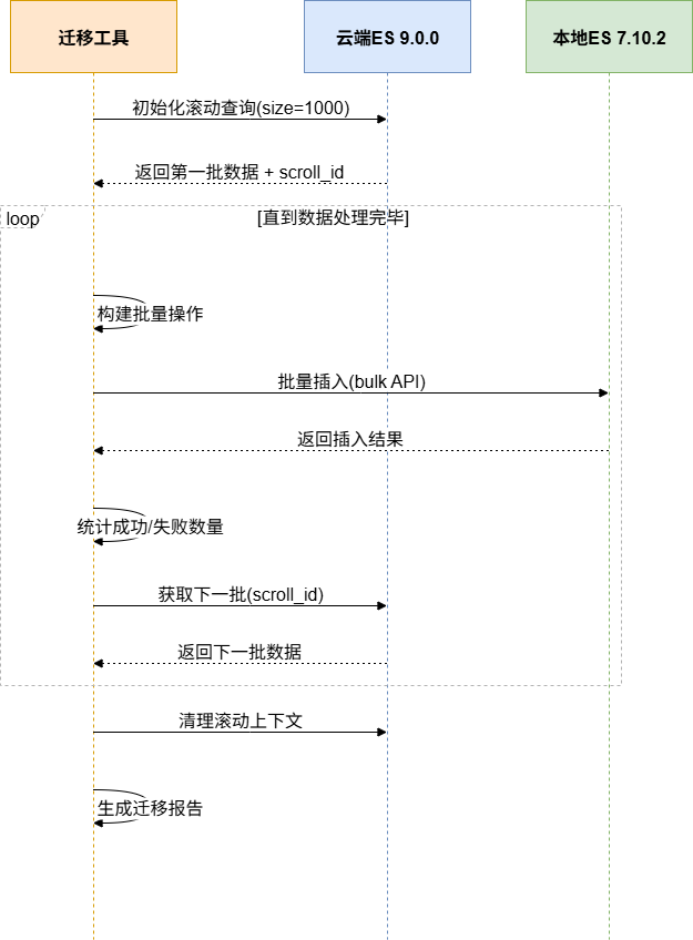 migrate_data(self, index_name: str) 函数采用 Elasticsearch 的 Scroll API 实现大规模数据集的分页迁移,通过 10 分钟滚动窗口和 1000 条/批次的配置在内存占用与传输效率间取得平衡。