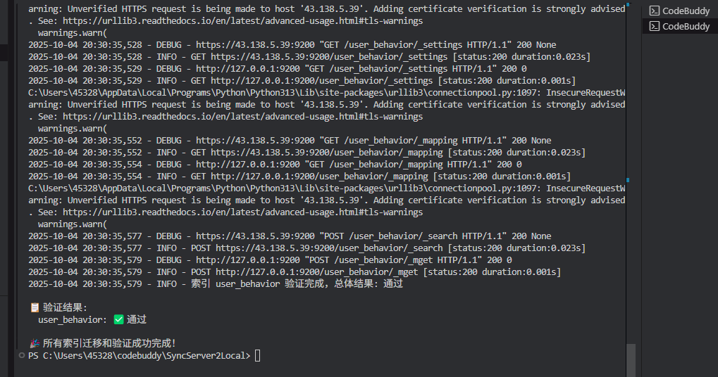 CLOUD_ES_CONFIG = { 'host': 'https: //外buIP地址', 'port': 9200, 'username': 'elastic', 'password': 'your-password', 'verify_certs': False, 'timeout': 60}# 本地Easysearch 7.10.2配置LOCAL_ES_CONFIG = { 'host': 'http: //127.0.0.1', 'port': 9200, 'timeout': 60}