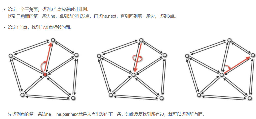 每条边分为两个方向相反的半边,半边记录起点、相邻面、下一个半边等信息。