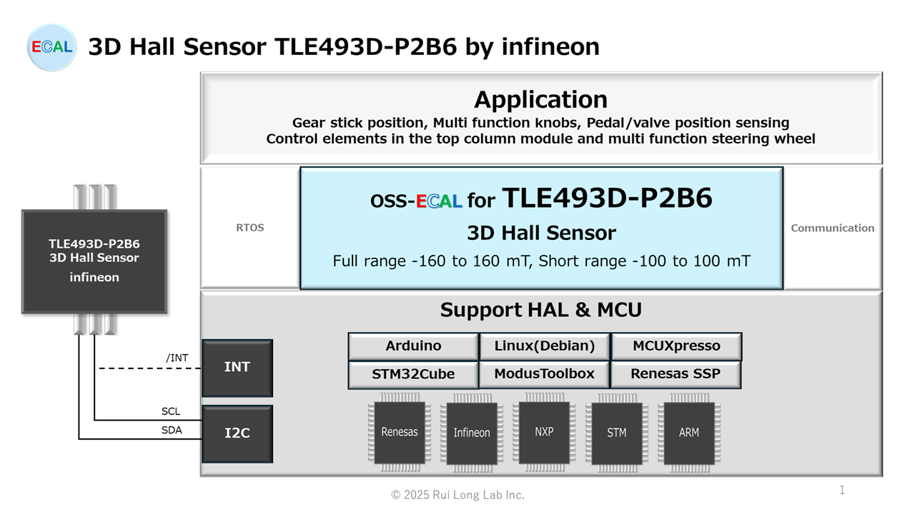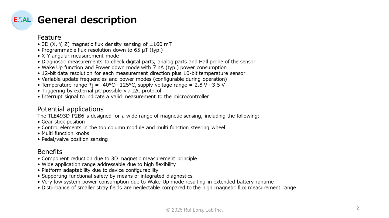 以下將介紹TLE493D-P2B6的概要,以及針對TLE493D-P2B6提供的OSS-ECAL。TLE493D-P2B6是英飛凌科技(Infineon)生產的高精度低功耗3D霍爾感測器(全量程-160至160 mT,短量程-100至100 mT)。