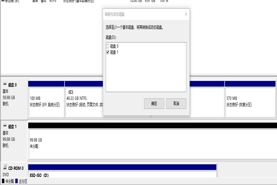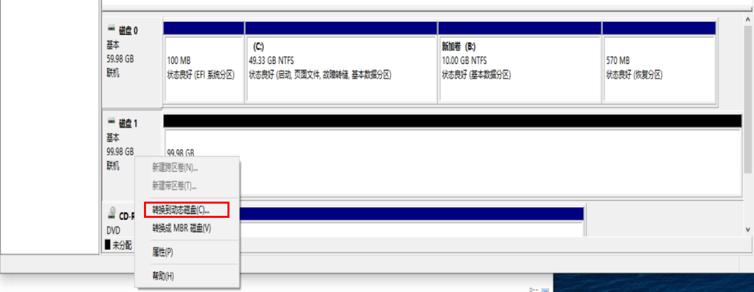 将基本磁盘转换为动态磁盘,右键点击需要转换的基本磁盘,点选"转换到动态磁盘"