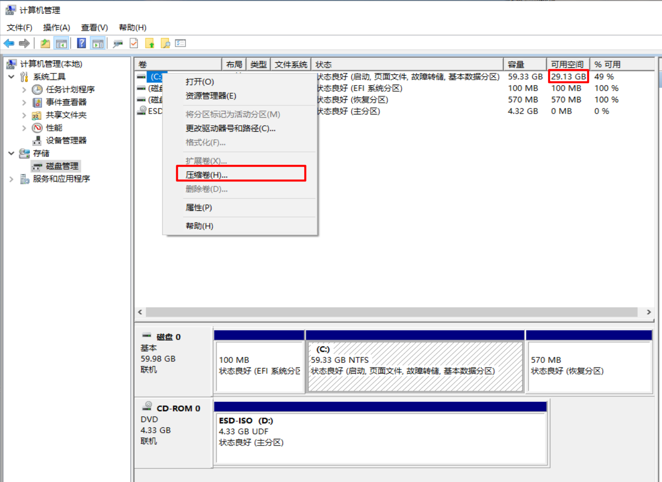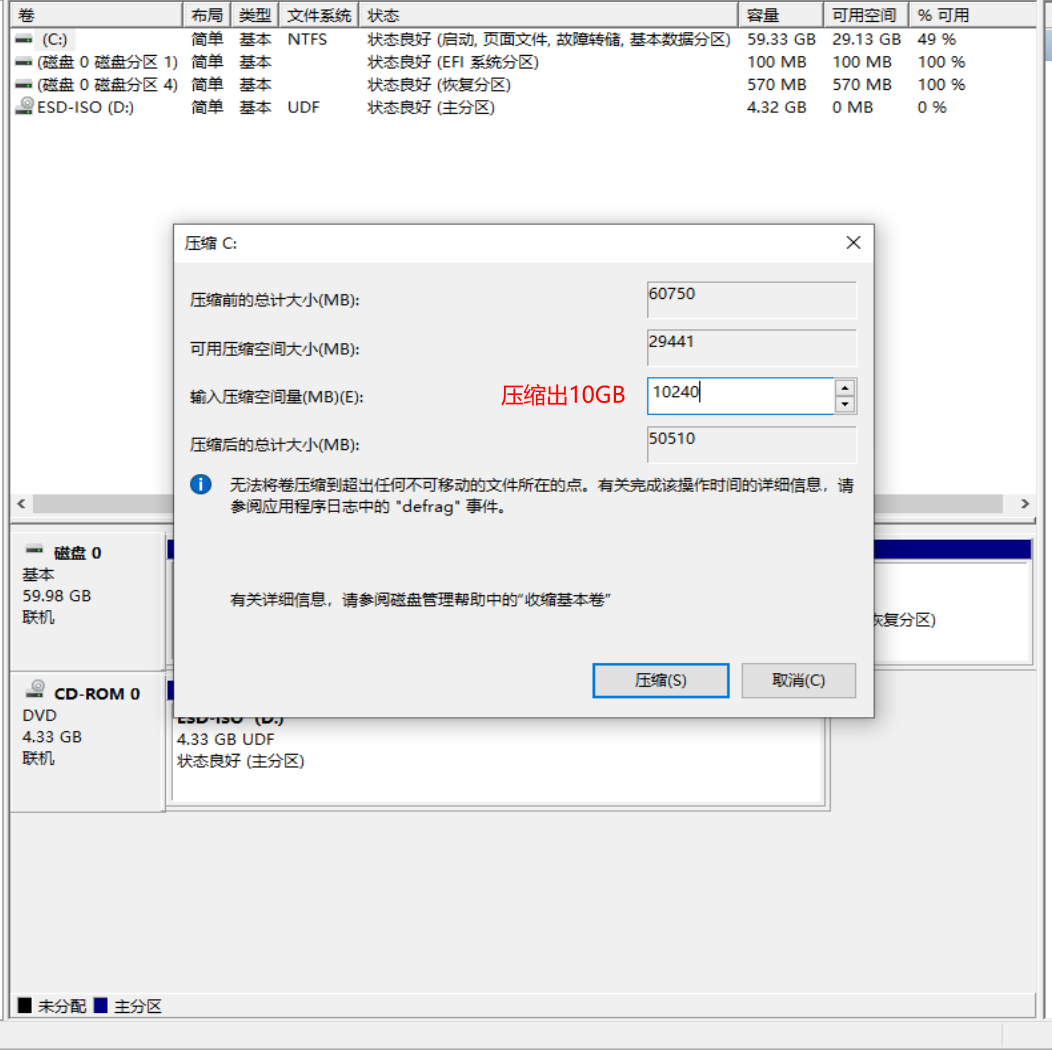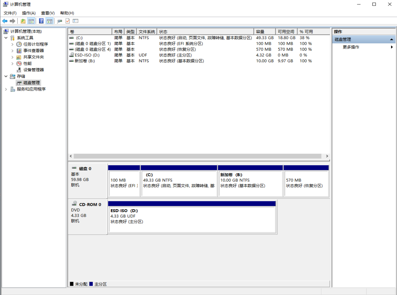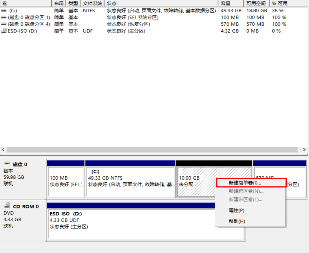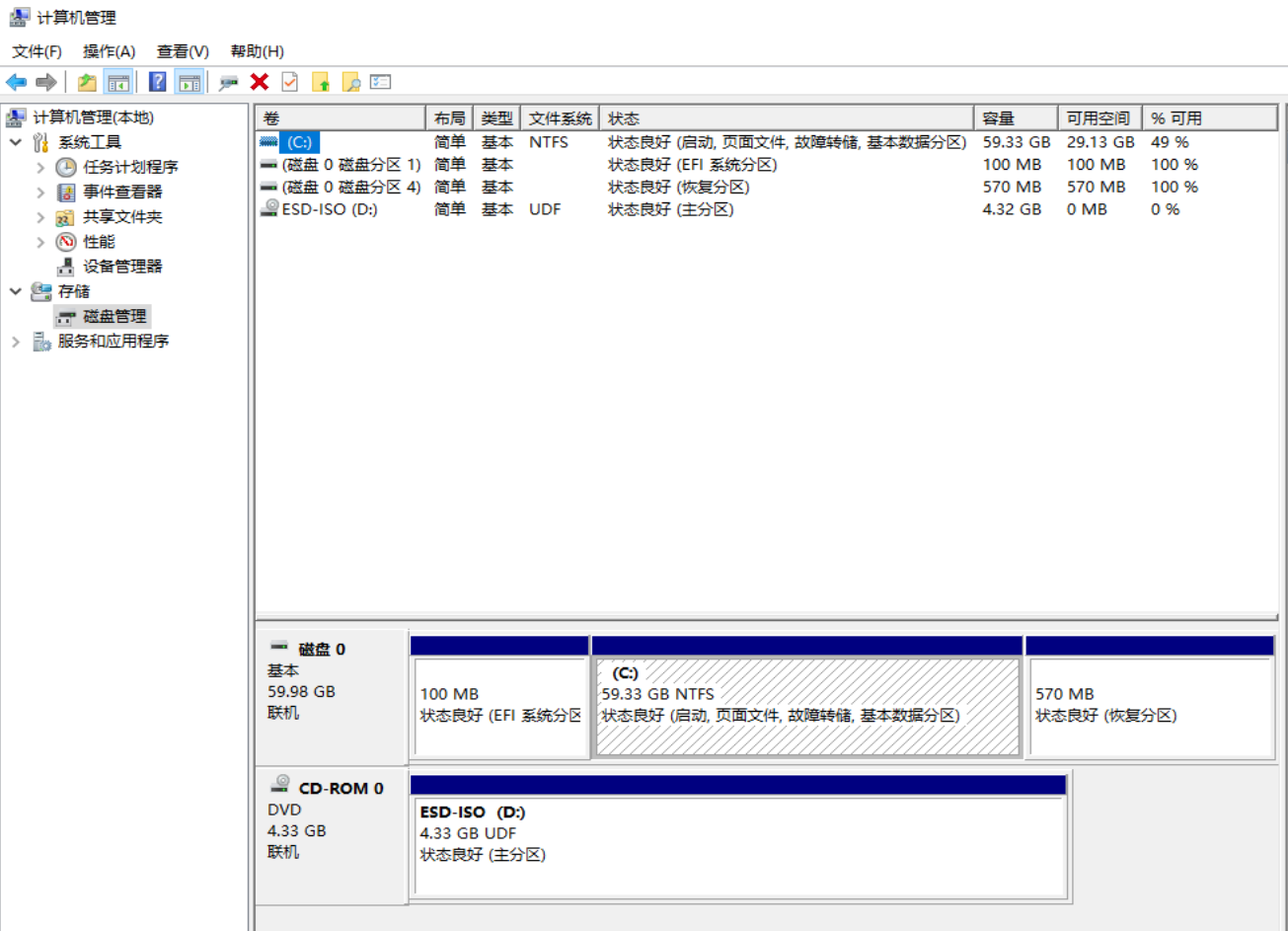 (2)在操作系统安装完毕之后,使用操作系统自带的磁盘管理程序进行管理