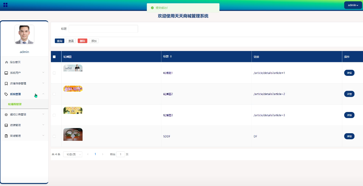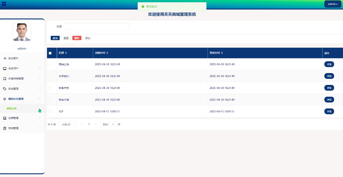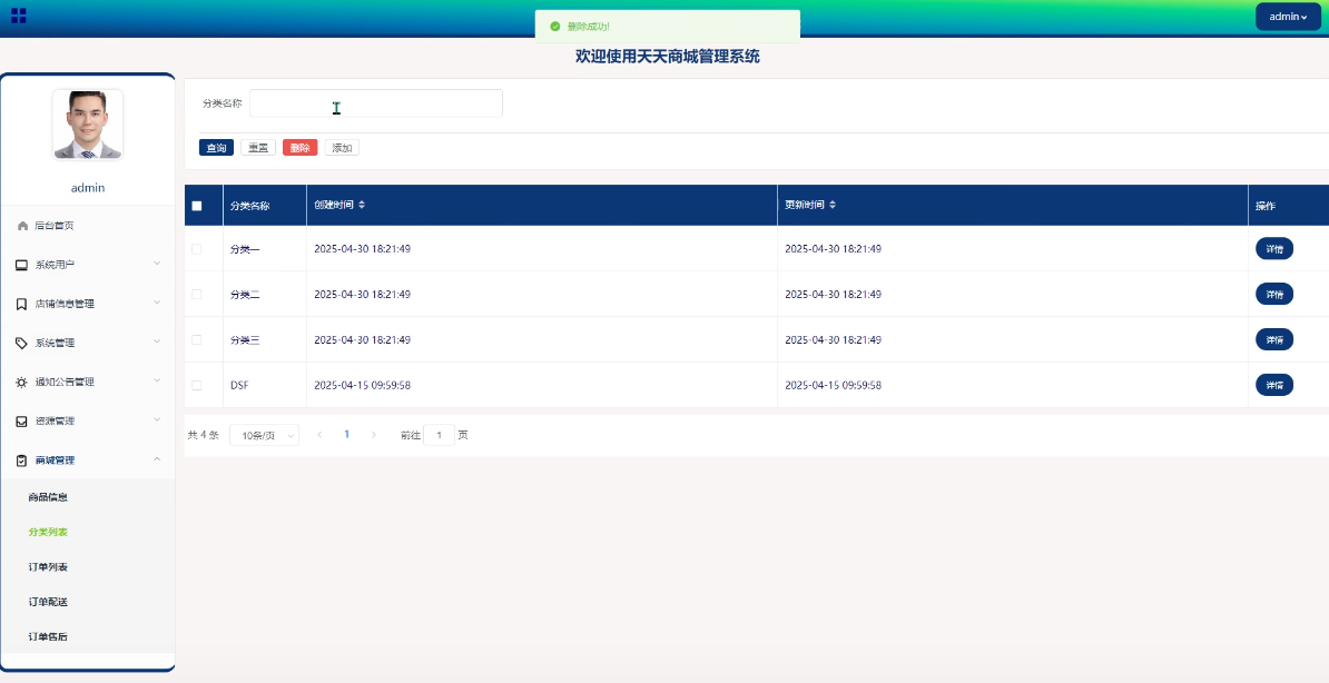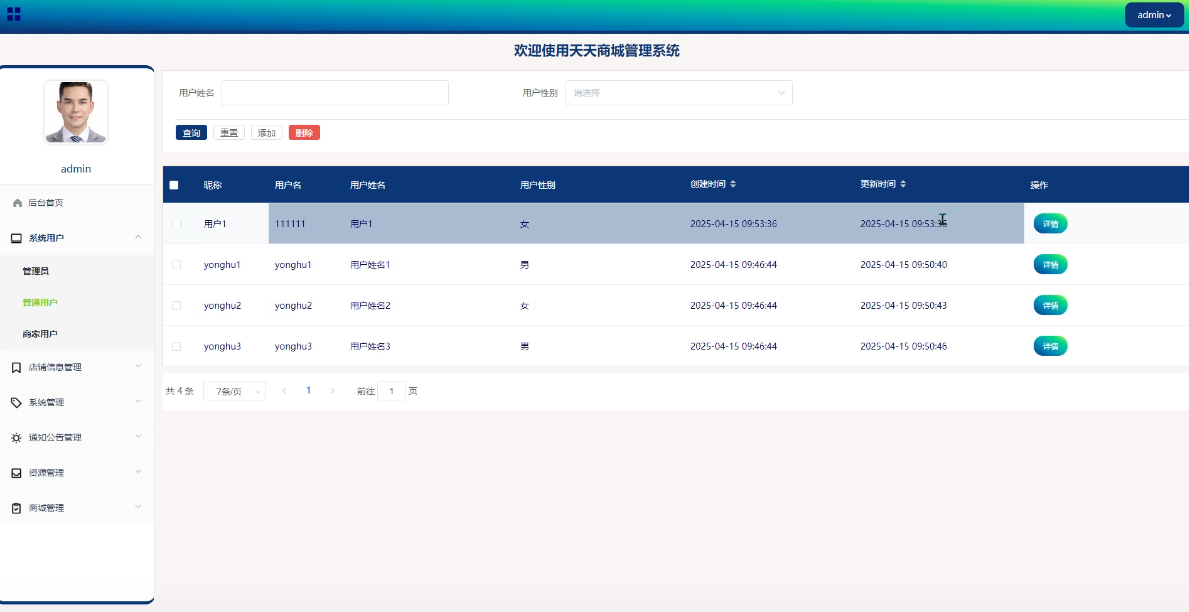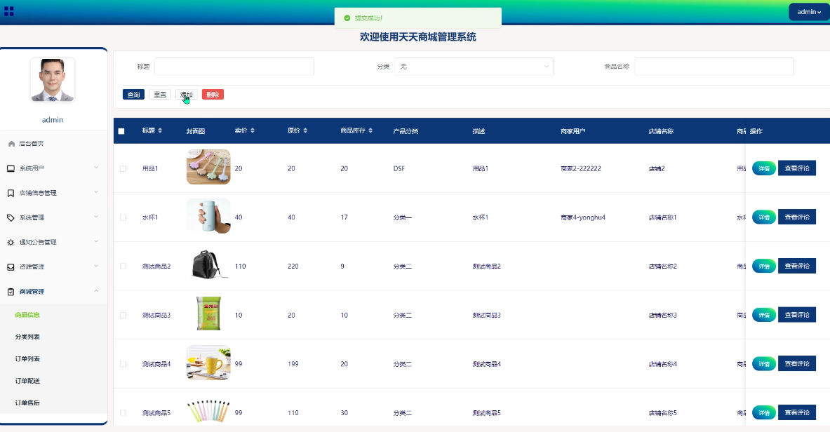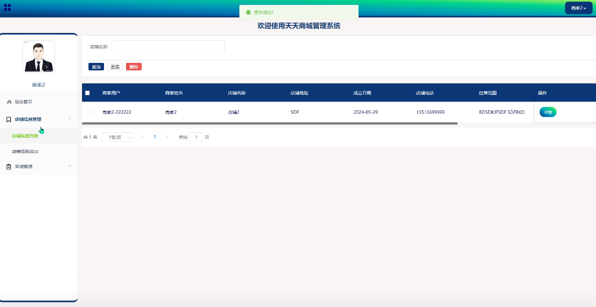 With the rapid development of e-commerce, the Tiantian Mall management system based on the SpringBoot framework has emerged to enhance user experience and system management efficiency. SpringBoot is highly favored in enterprise applications due to its advantages of simplified configuration and fast build. The system mainly targets three types of users: regular users, administrators, and merchant users. Ordinary users can enjoy services such as registration and login, browsing product information, viewing mall information, managing shopping carts and personal orders, and can also view delivery status and favorite products through their personal center. The design of these features enhances users' shopping experience and platform stickiness. Administrators obtain statistics on the number of users and merchants through the backend homepage, and manage system users, store information, carousel images, notifications and announcements, and resources. This comprehensive management capability ensures the freshness of platform content and the stable operation of the system. For business users, they are able to manage their store information, product categories, order lists, as well as handle order delivery and after-sales service. This design helps improve the operational efficiency and service quality of merchants, and promotes the overall development of e-commerce platforms.