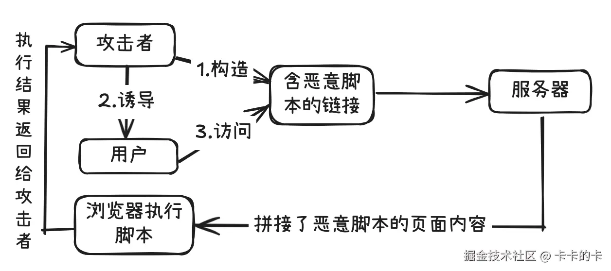 原理:恶意脚本作为请求的一部分,经服务器反射后,在受害者的浏览器中执行。(常见于搜索、错误信息页面)