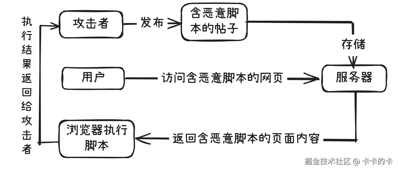 攻击者向网页中注入恶意脚本,当用户浏览该页面时,脚本被执行,从而达到盗取用户Cookie、会话Token,篡改页面内容,进行恶意操作,传播蠕虫等目的。