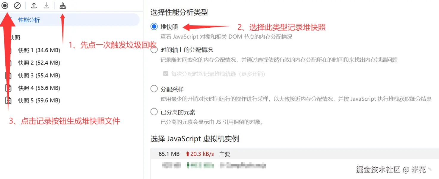 Heap snapshot 可以记录内存堆快照。内存堆快照中只包含可访问的对象,在开始记录内存堆快照前,手动执行一次内存回收。我们可以通过比较前后两次堆快照数据来分析内存泄漏问题。