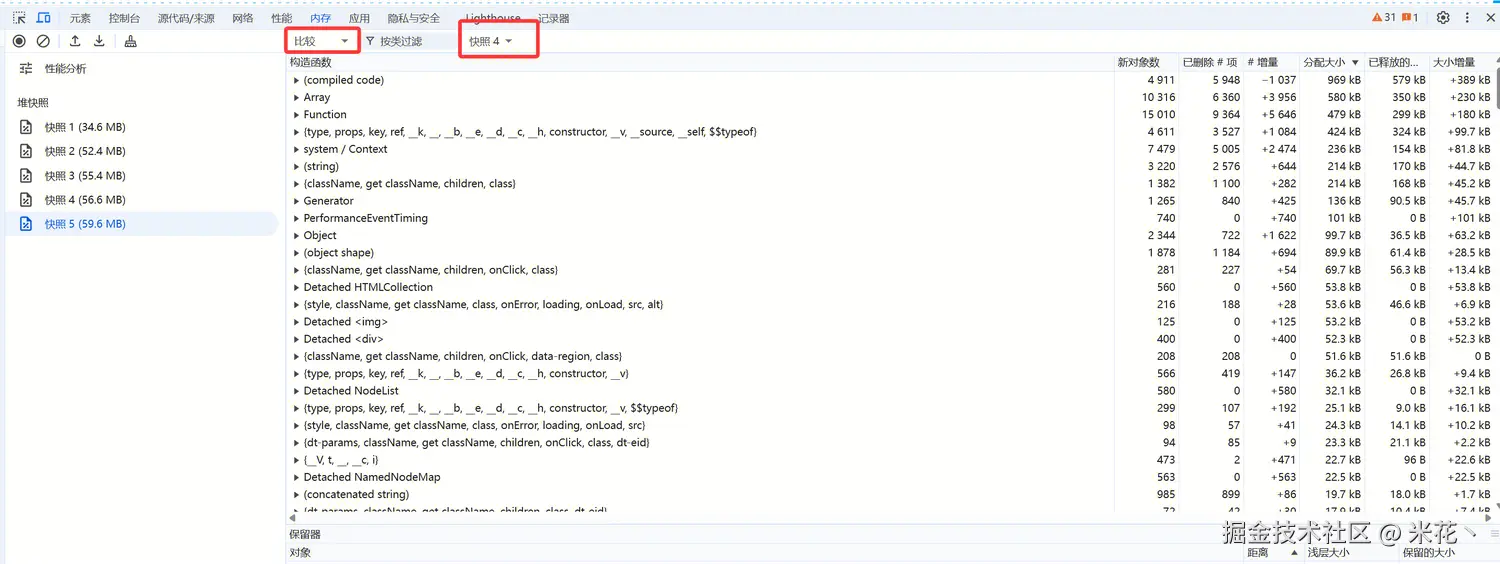 选择快照5,用比较选项,在右侧选择快照4,分析快照5和快照4的堆内存差异