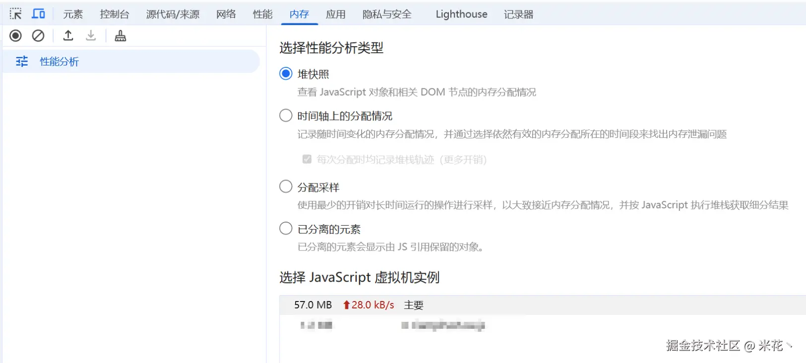 打开谷歌浏览器的调试页面,选择Memory Tab