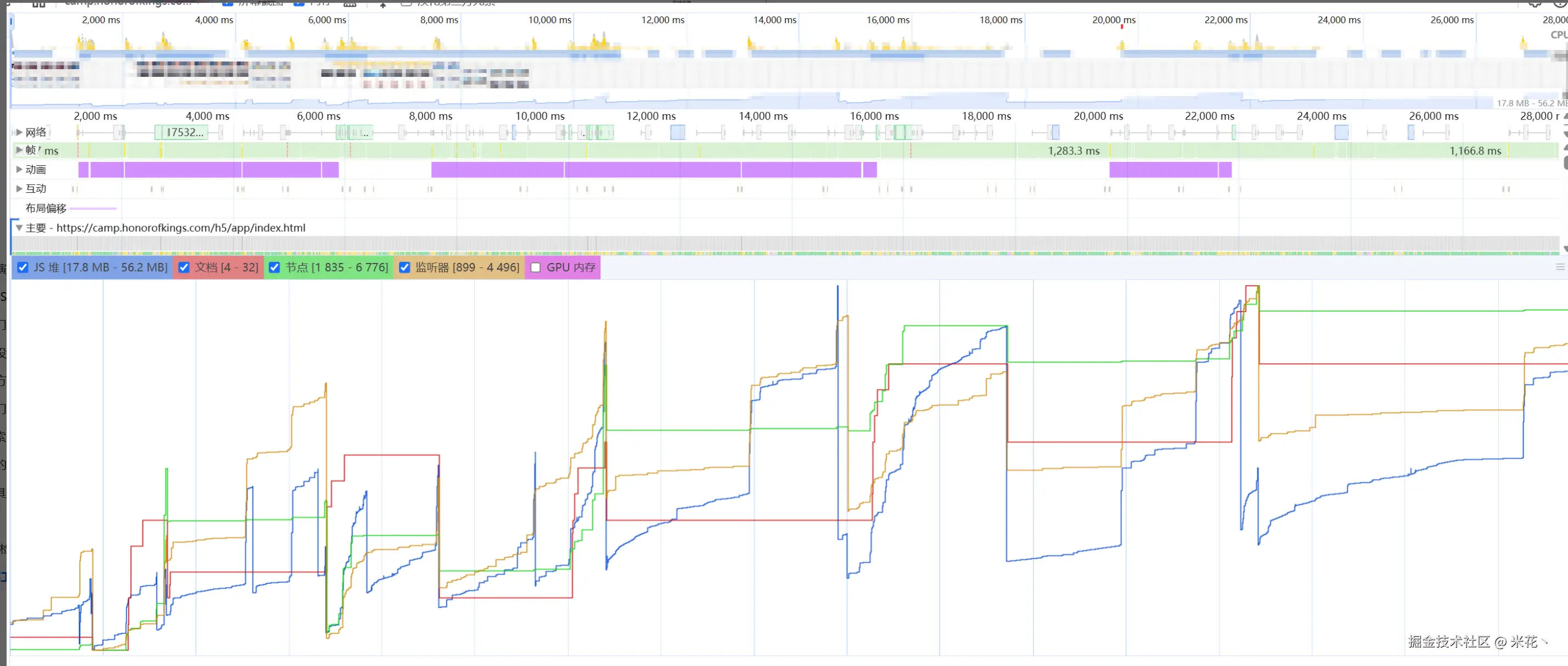 因此注意在记录之前及记录结束时都要按一下上方的垃圾桶图标进行手动垃圾回收,可以确保两次内存快照中都没有即将被清除掉的内存占用。如果结束时js heap图像没有下降,一直是阶梯式增长,那么很有可能页面存在内存泄漏。