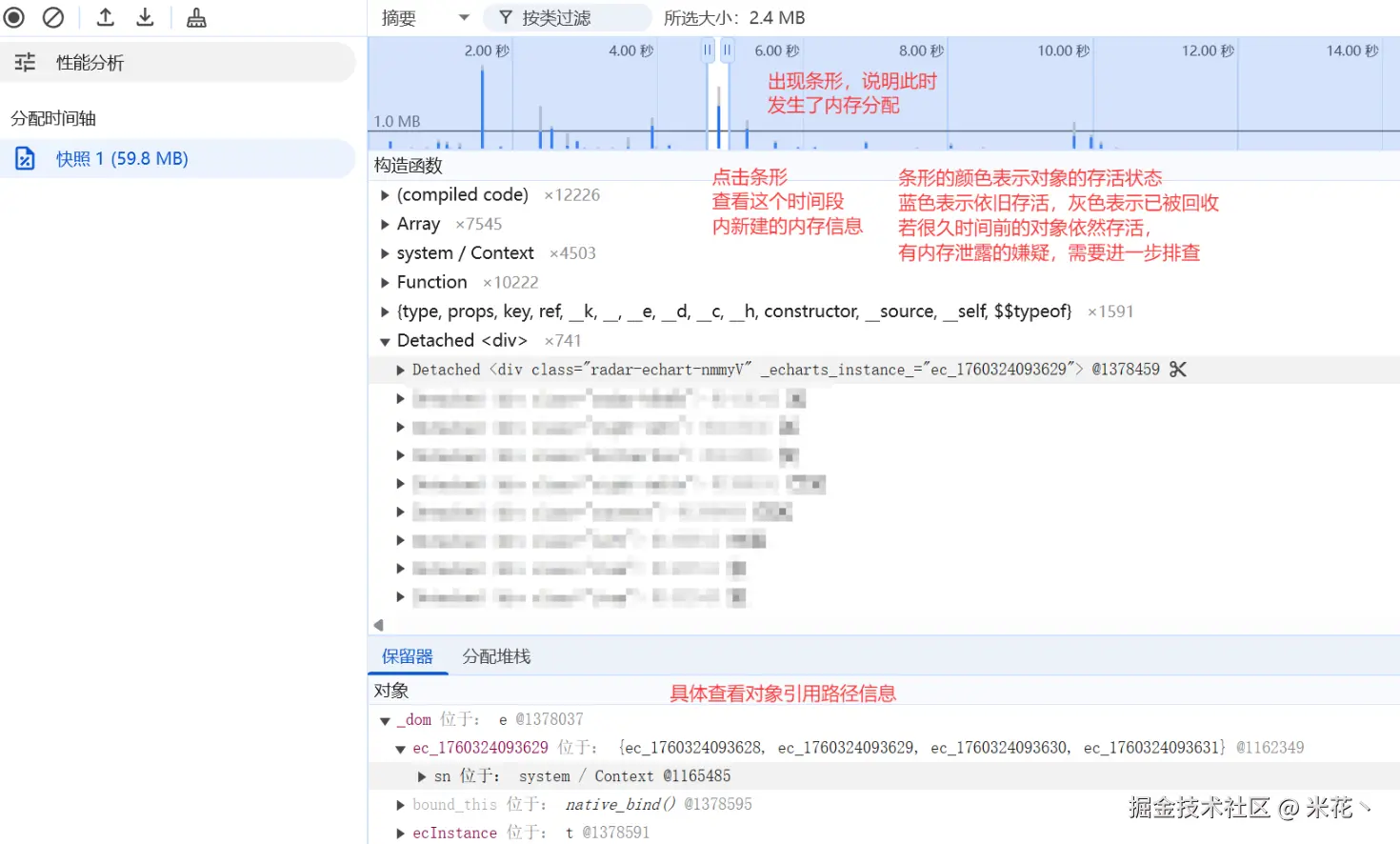 最上方的时间轴中,条形说明在该时间段发生了内存分配。条形的高度对应了分配的内存大小,条形的蓝色部分说明依然存活的对象数量,灰色部分说明已经被 GC 的对象数量。如果较早时间分配的对象依然大量存活,则说明可能有内存泄漏的问题。我们可以点击时间轴上该条形,检查该时间段内的详细内存分配信息。