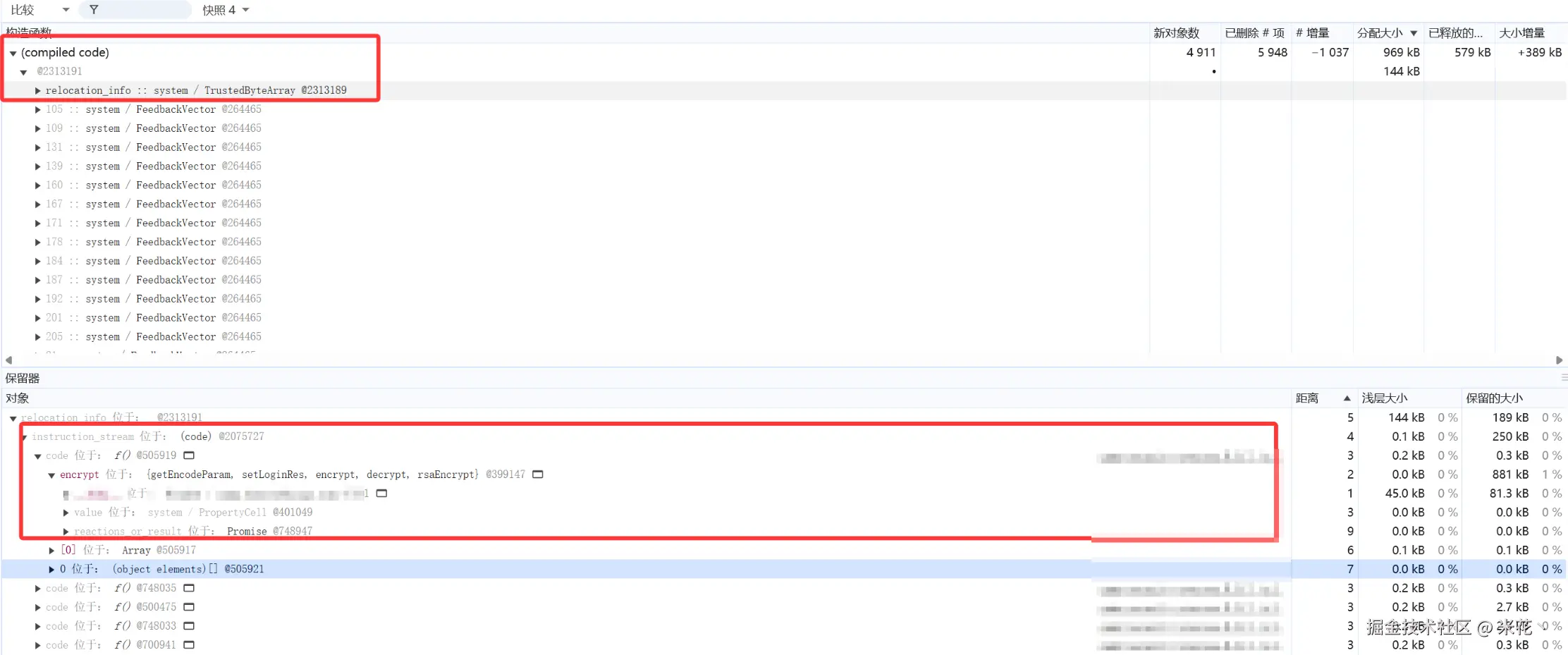 (一个 DOM 元素)等。×后面的数字:这个类型的对象一共创建了多少个。展开">"后,@后面的数字:对象的唯一编号,定位用。一些常见类型举例说明:compiled code