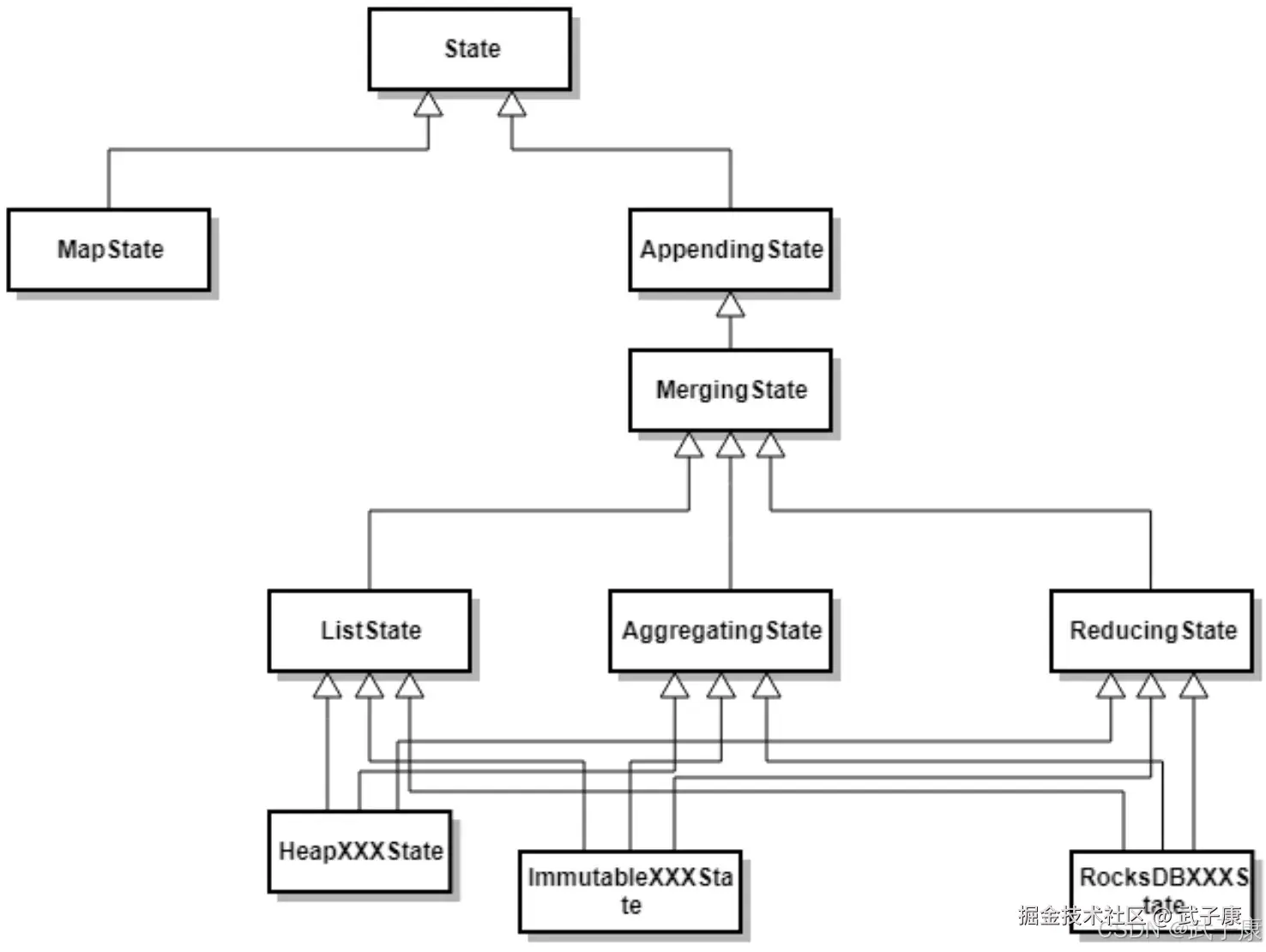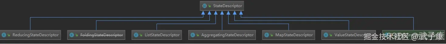 在对应的StateBackend中,会去调用对应的create方法获取到stateDescriptor中的值。 Flink通过StateDescriptor来定义一个状态,这是一个抽象类,内部定义了状态名称、类型、序列化器等基础信息,与上面的状态对应,从StateDescriptor派生ValueStateDescriptor、ListStateDescriptor等等