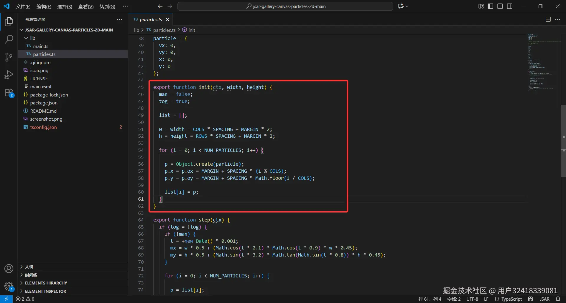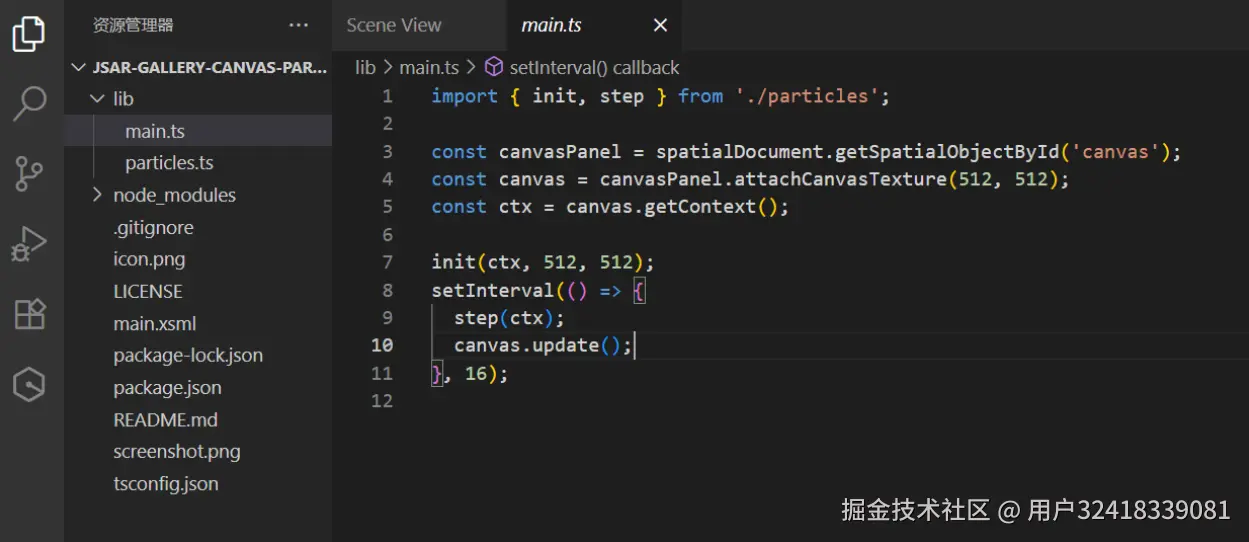 JSAR 粒子效果的核心集成逻辑:导入 particles.ts 的 init 和 step 函数,通过 JSAR-DOM API 获取 3D 球体元素,为其绑定 512x512 尺寸的 Canvas 纹理并获取 2D 渲染上下文;初始化粒子系统后,以 16ms 每帧的定时器循环调用 step 函数计算粒子运动并渲染,同时调用 canvas.update 同步更新球体纹理,确保 AR 场景中粒子效果正常显示