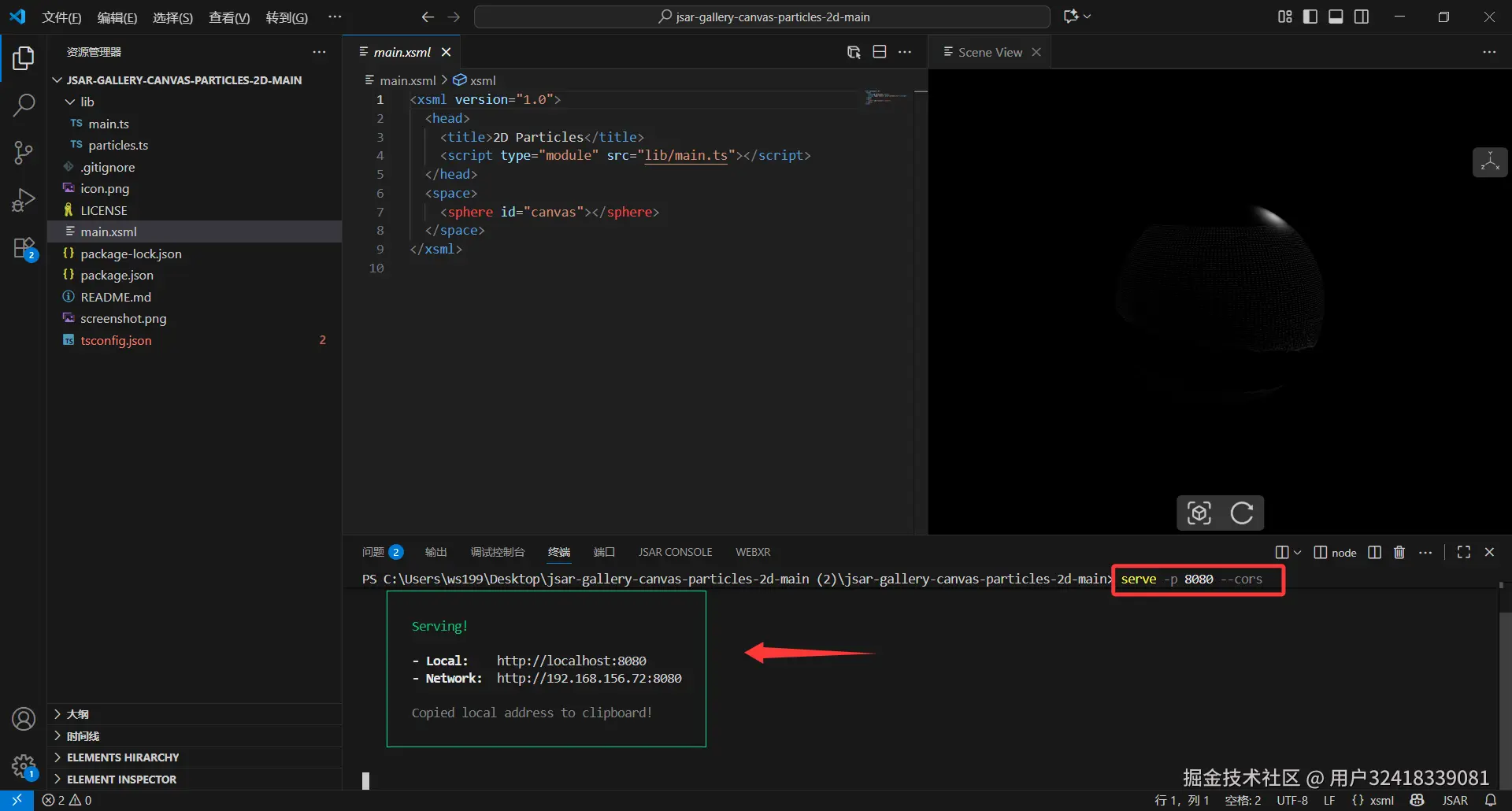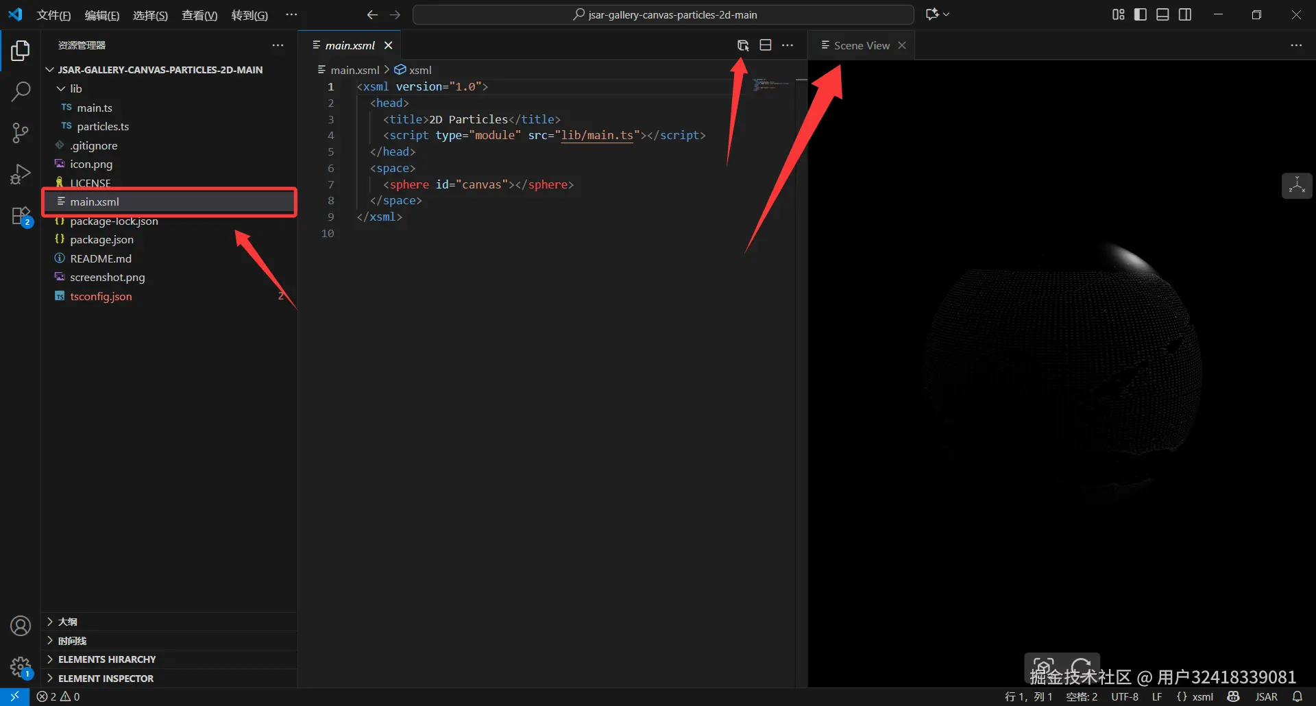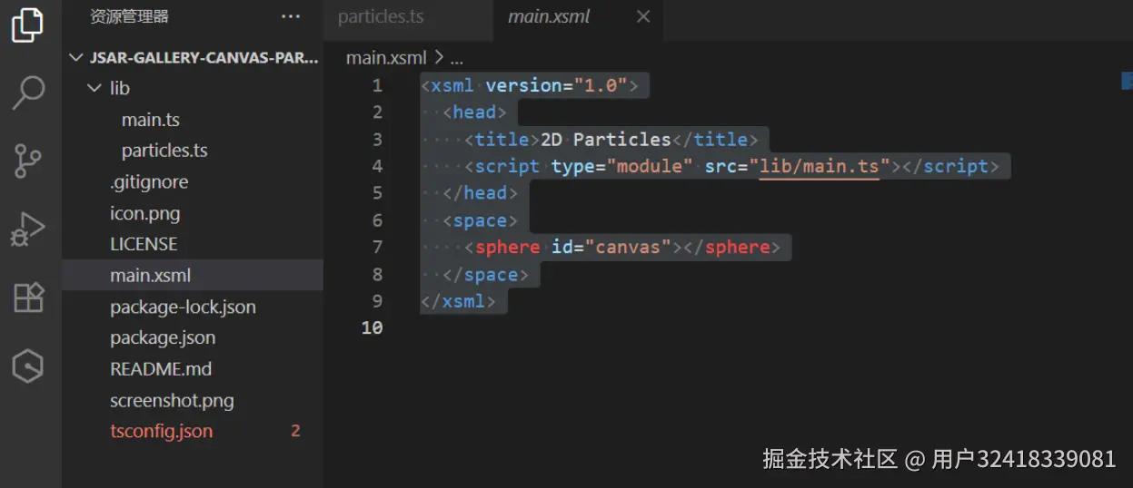 xsml 代码是 2D 粒子画廊项目的入口配置:通过 head 标签设置项目标题并引入业务逻辑文件 lib/main.ts,再以 space 标签作为 3D 空间容器,内部定义 id 为 canvas 的 sphere 球体元素作为后续 Canvas 粒子纹理的承载载体,为 JSAR 运行时解析 3D 空间结构、绑定粒子效果奠定基础