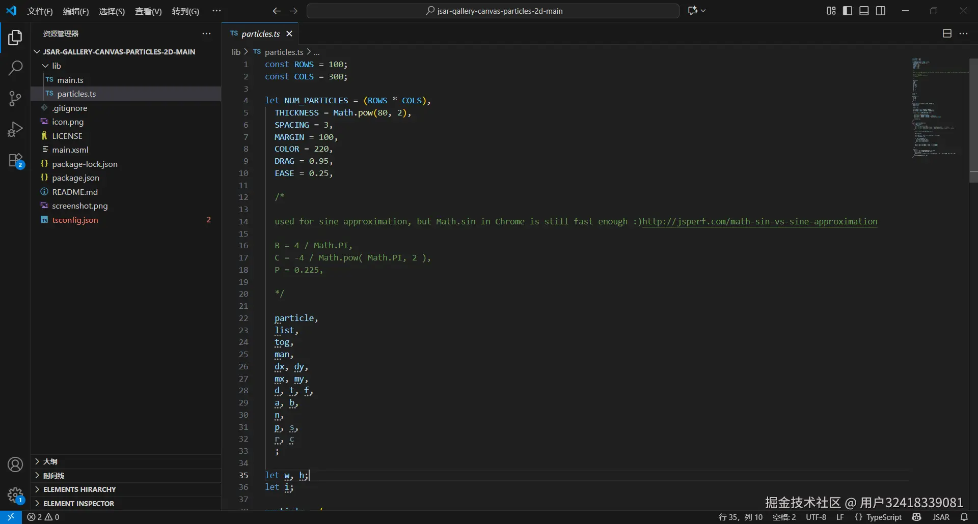 定义粒子数据结构与全局配置,通过 init 函数完成粒子初始化:计算基于网格行列数和边距的画布尺寸,按网格规则创建粒子数组,为每个粒子分配均匀分布的初始位置,使当前位置与初始位置一致