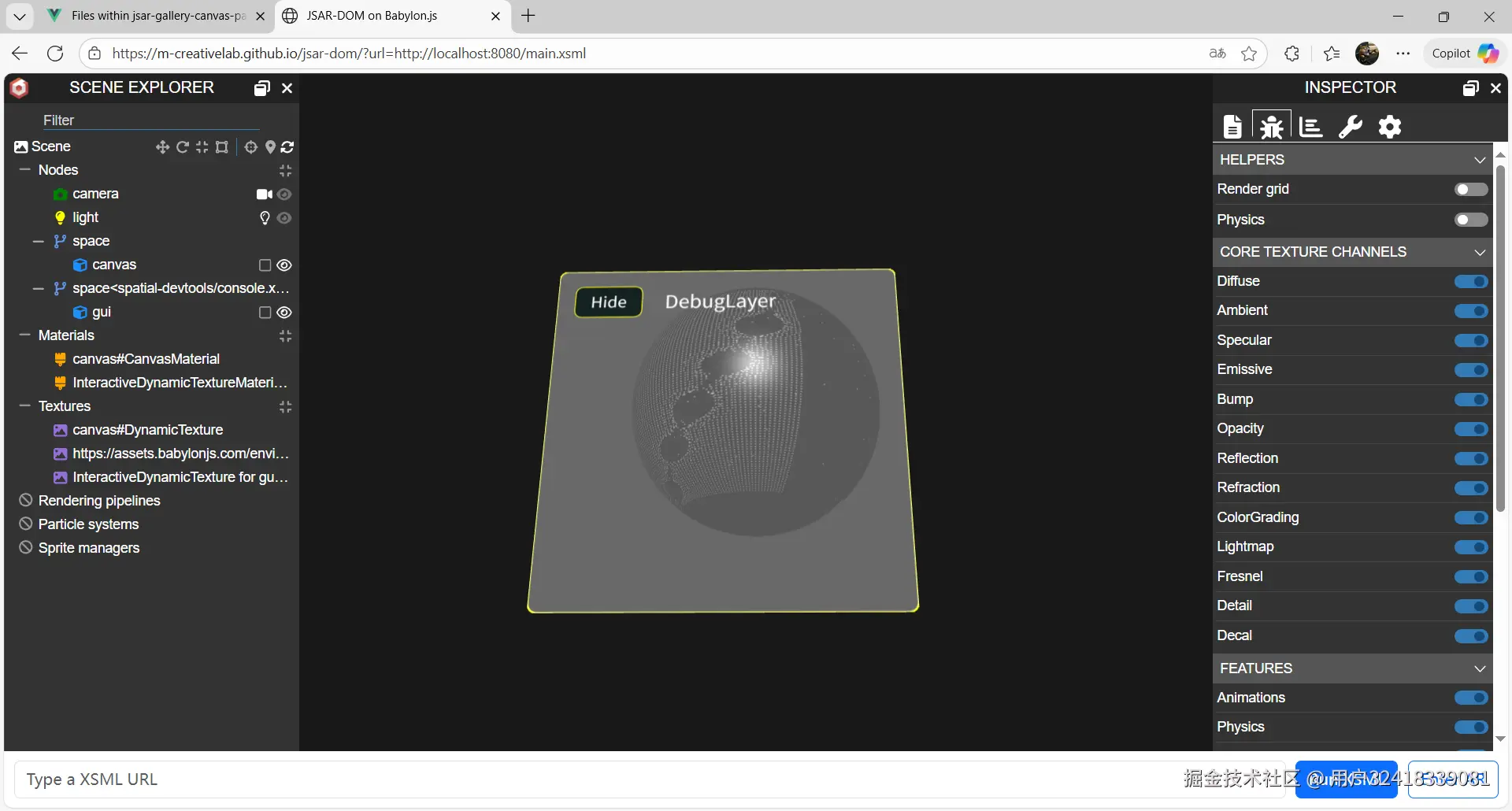 借助 glTF Tools 插件可高效验证项目效果:其能解析 3D 资源(如 model/welcome.glb 模型、组件结构),预览 3D 球体形态、Canvas 粒子纹理与球体的绑定适配效果,还可提前排查纹理映射偏差、模型加载兼容性等问题,避免后续 JSAR 运行时出现粒子错位、3D 渲染异常