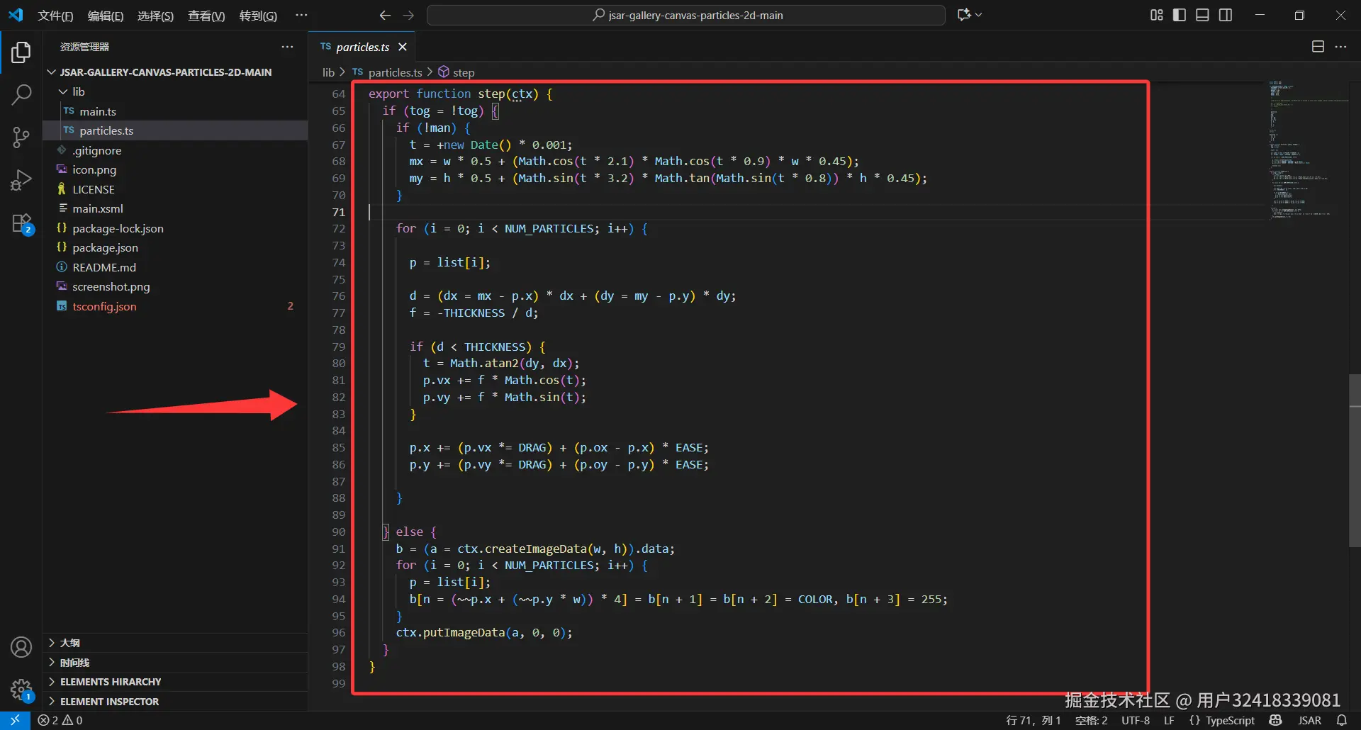 通过 step 函数实现粒子帧更新:定义阻尼、缓动等全局配置,采用双帧分工逻辑,一帧计算粒子运动,另一帧通过 ImageData 直接操作像素数组渲染粒子