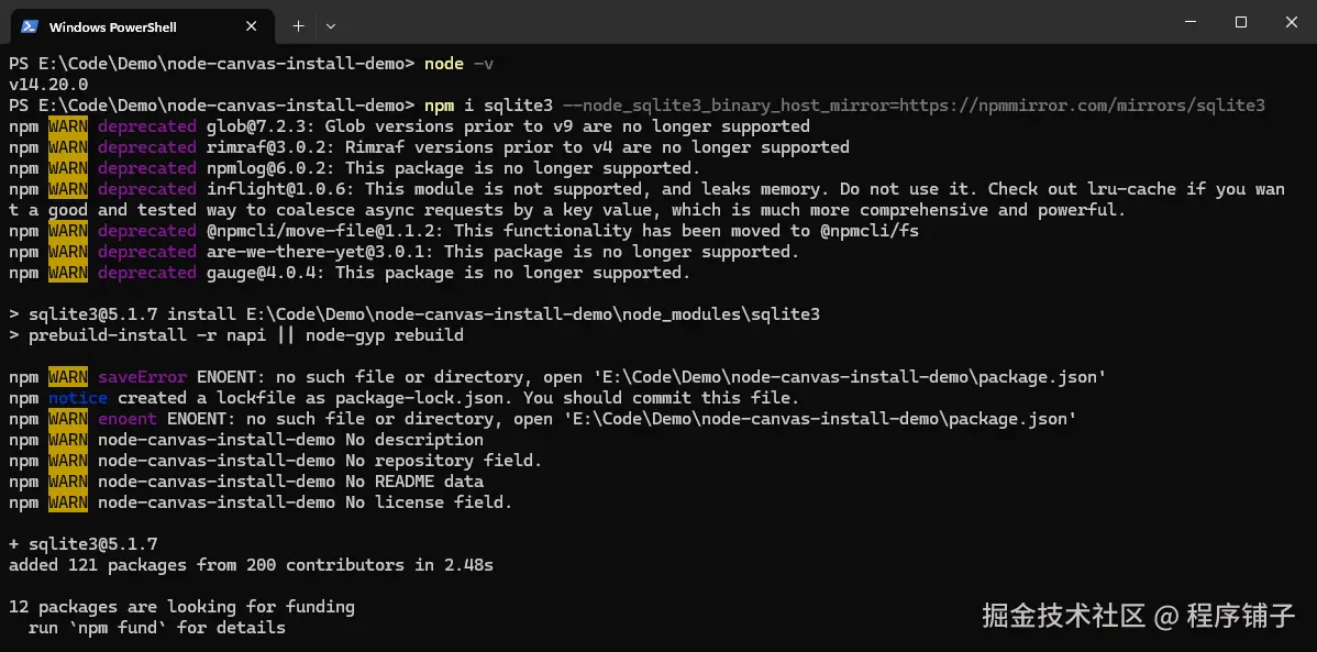 如上图所示,我在安装这些包的时候,用的是 win11 系统,Node 版本是 14.20.0。如果你用的是其他系统或者其他版本的 Node,使用上面的命令也可以安装成功。