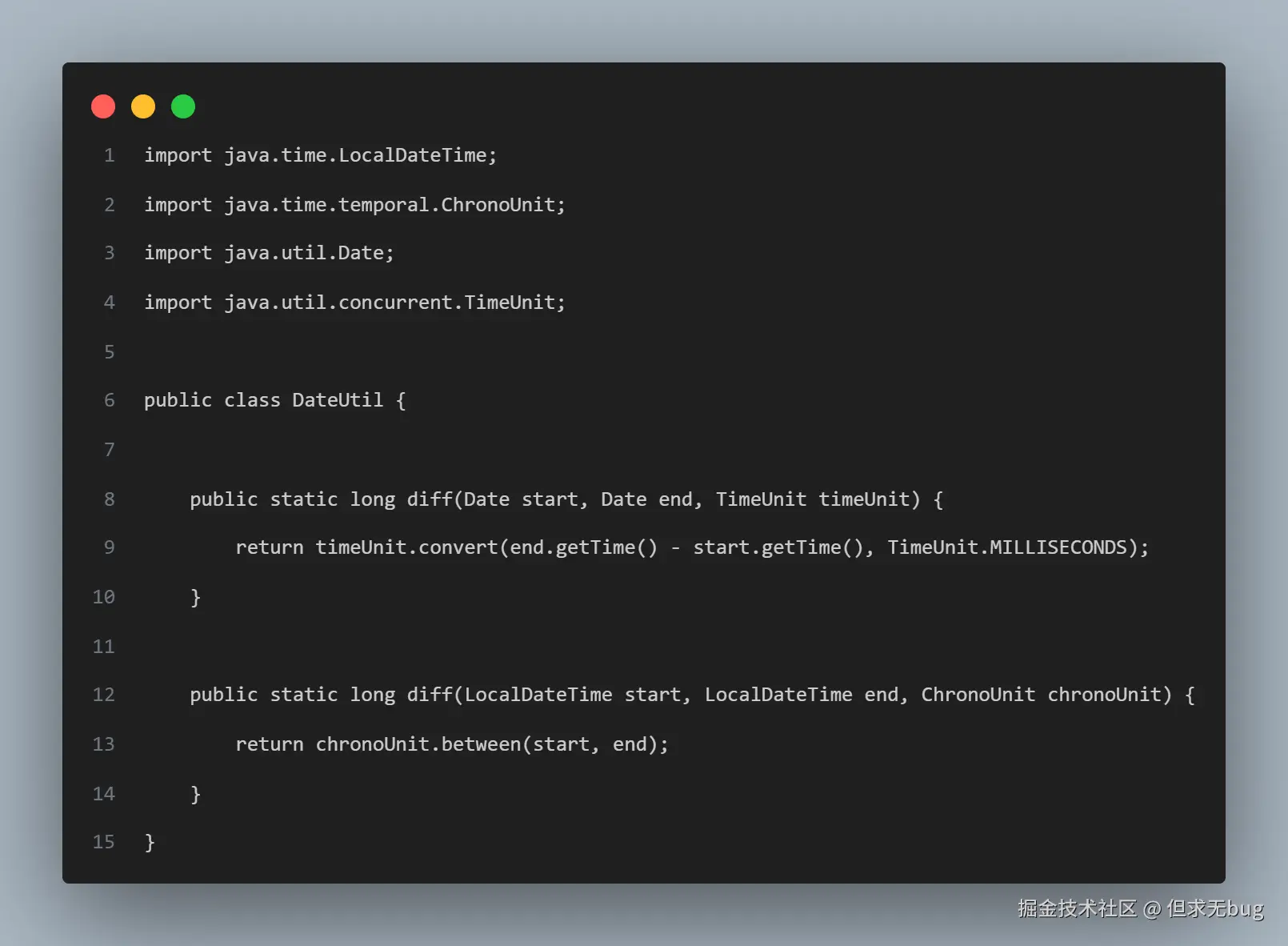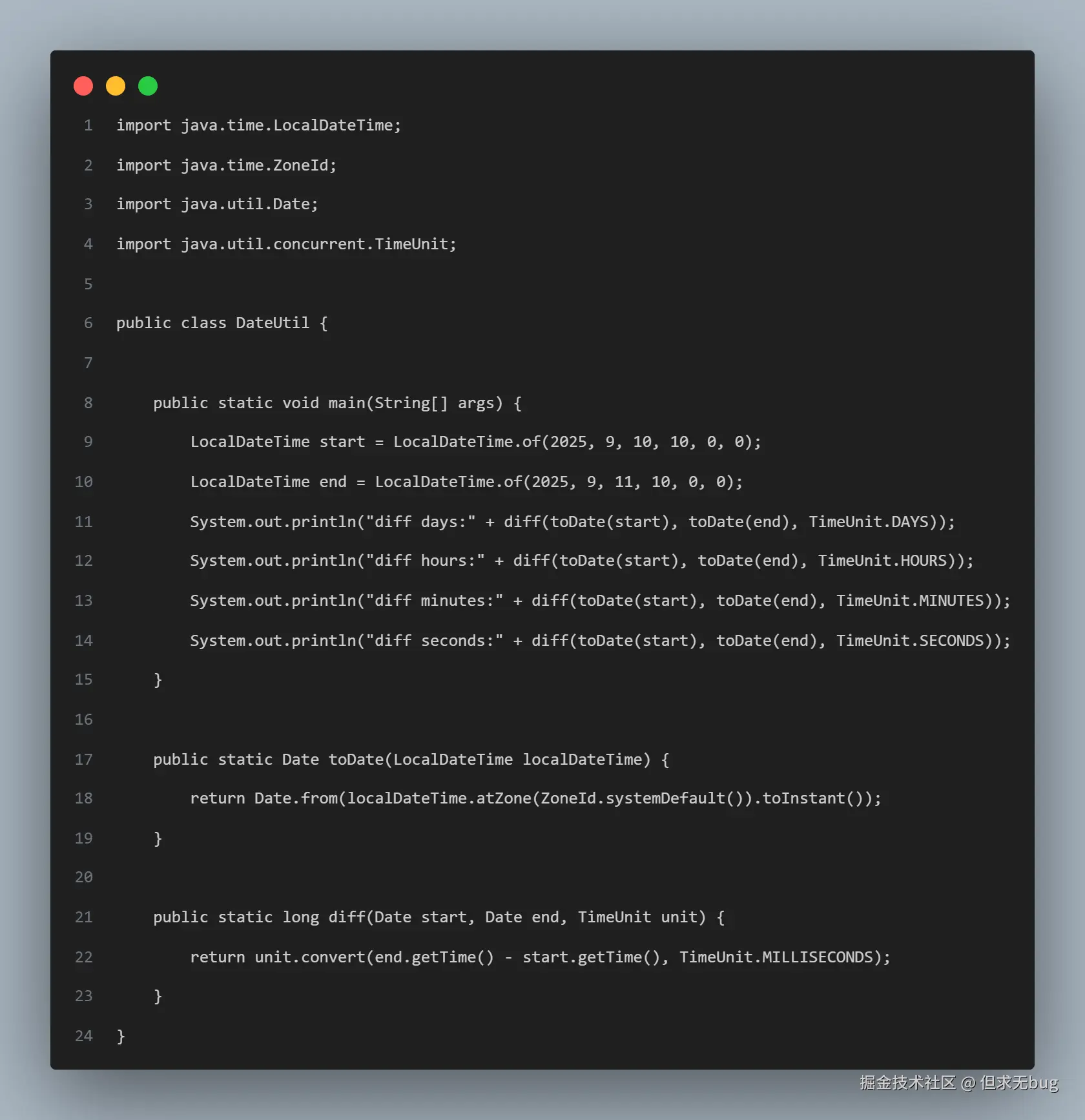 当然,如果日期类型为 Date,以上已经算是最优实现方式了。但偶尔会实用 Java8新加入的日期类型 LocalDateTime 来表示时间。此时又该如何计算两者相差时间呢?当然,可以写一个转换方法,将 LocalDateTime 转换为 Date 后调用diff 方法。下面为对应的实现